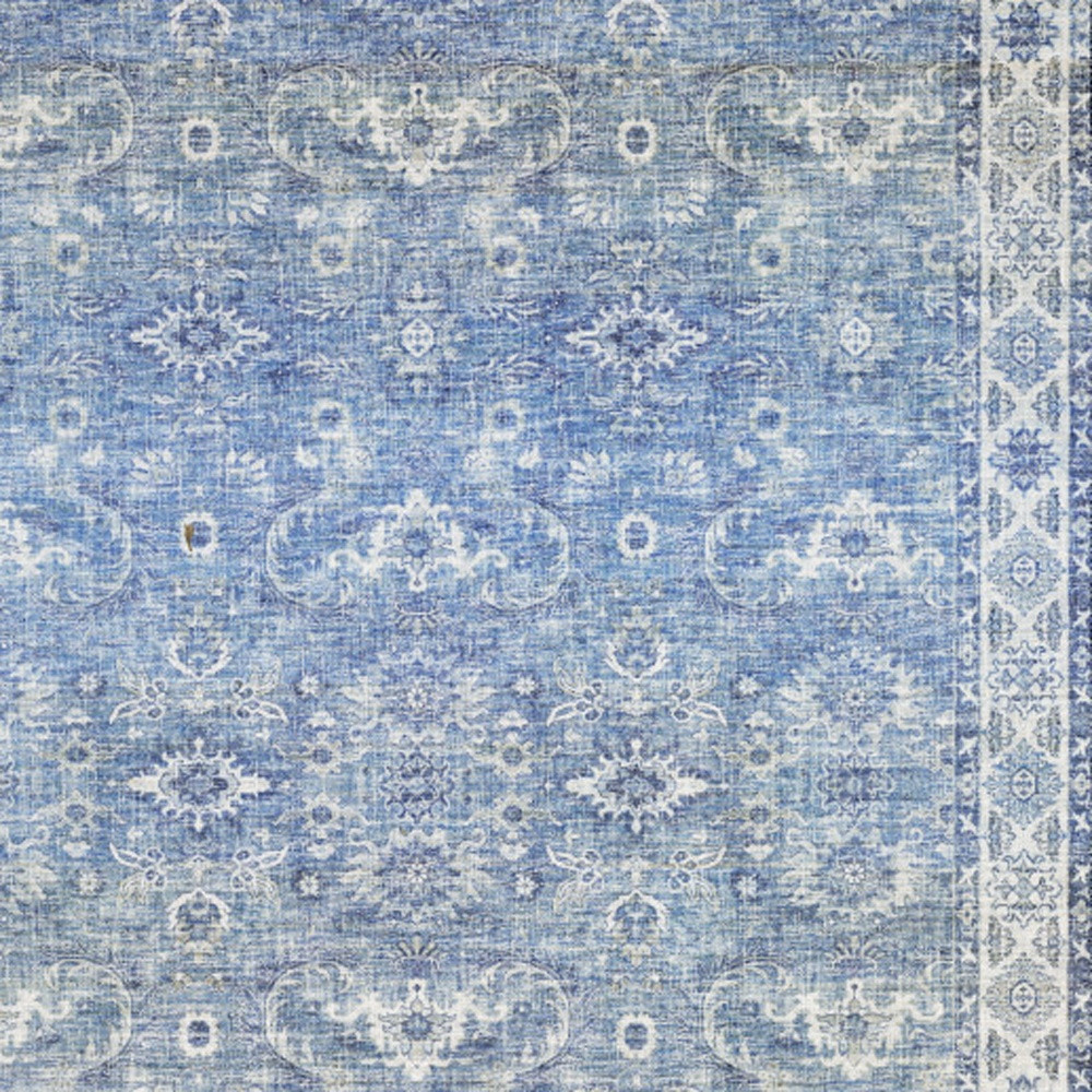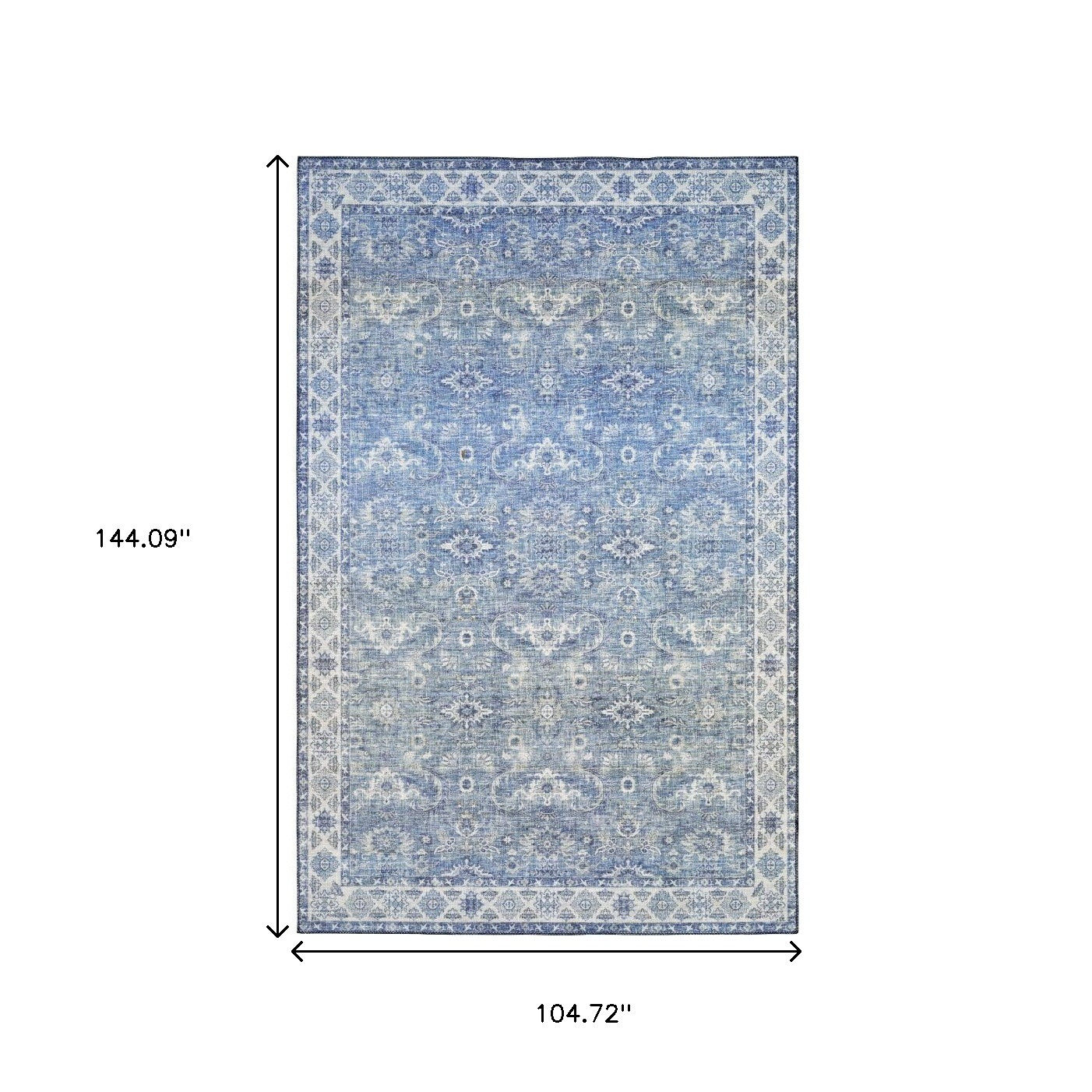 This 9-foot x 12-foot blue and ivory oriental distressed area rug, is a great way to add warmth to a room. Ideal for spaces with kids and pets, this rug is stain resistant to help repel dirt and spilled liquids. Built to last, this rug crafted from polyester fibers is known for its durability and long lasting appeal. Rugs are a great way to showcase your style, hide imperfections, warm your home and reduce noise. 104.72-inch h x 144.09-inch w x 0.11-inch d.