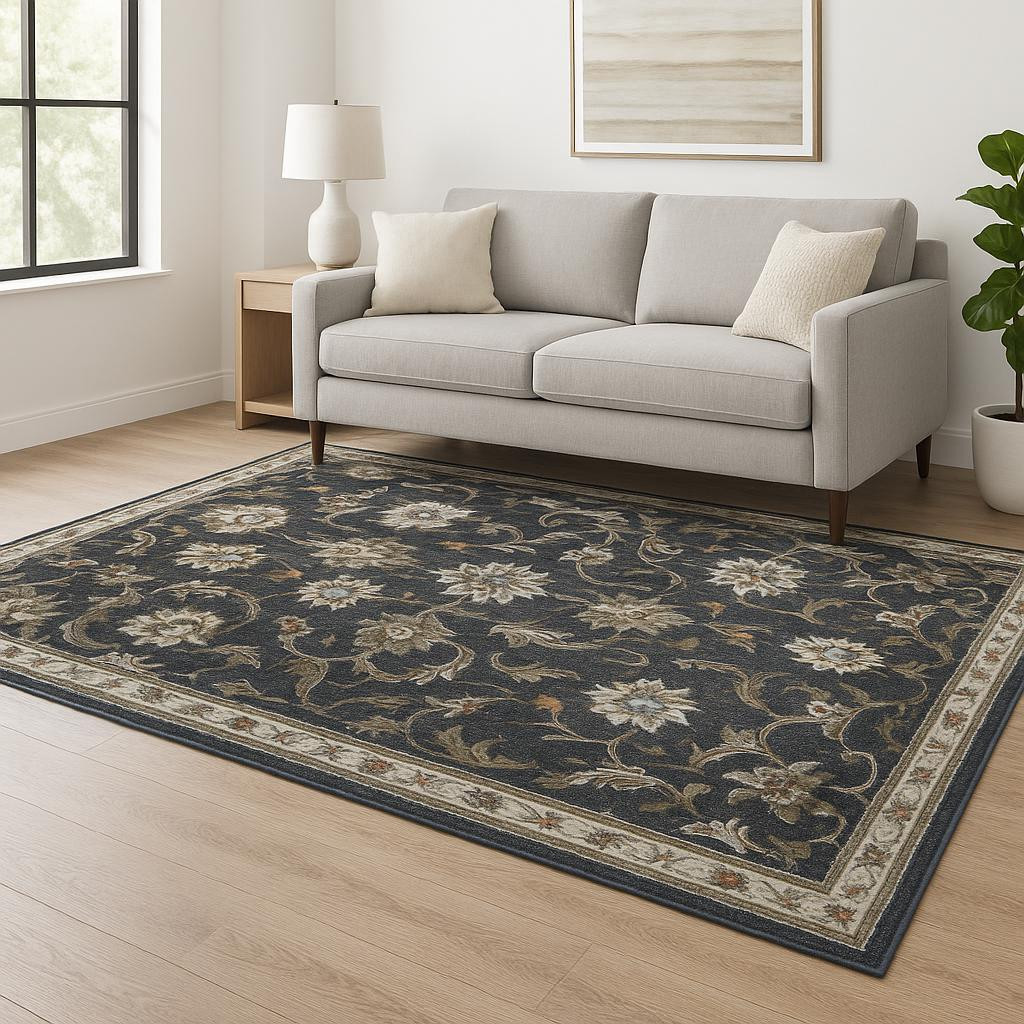 Add great coloration and comfortable texture to your space with this 5' x 7' charcoal blue gold rust and beige oriental power loom stain resistant area rug. This rectangle shaped rug features a oriental design in charcoal blue gold rust and beige to give it visual interest. A classic shape marries with good looking design for your space Ideal for spaces with kids and pets, this rug is stain resistant to help repel stains and spilled liquids. Place this area rug against a hardwood or tile floor and it will enliven your living space with style and sophistication. 0.31" H x 62.99" W x 86.61" D