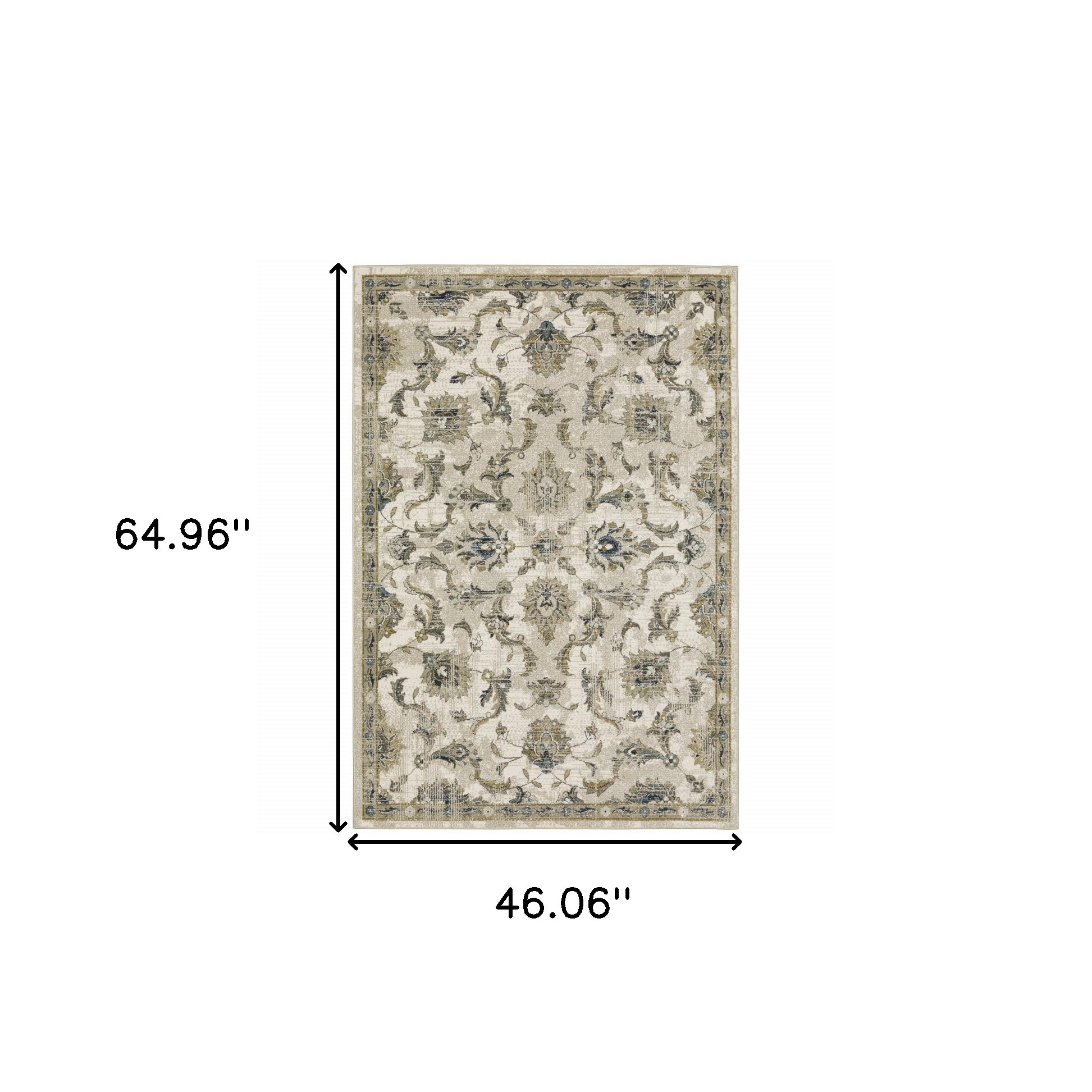 This 4' x 6' beige gold blue and grey oriental power loom stain resistant area rug, is a great way to add warmth to a room. This rectangle shaped rug features a oriental design in beige gold blue and grey to give it visual interest. A classic shape marries with good looking design for your space Ideal for spaces with kids and pets, this rug is stain resistant to help repel stains and spilled liquids. Area Rugs help to give warmth and sense of home to your space. 0.31" H x 46.06" W x 64.96" D