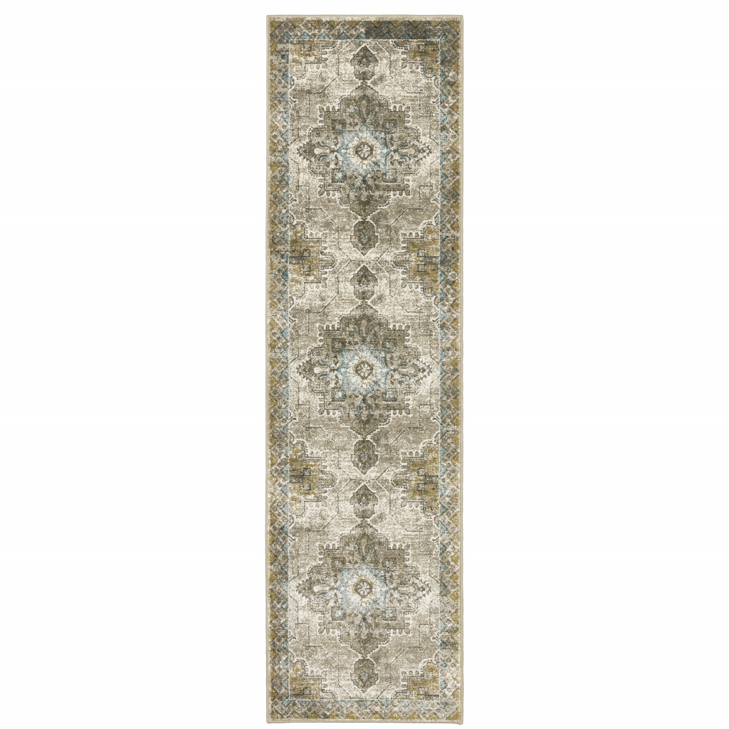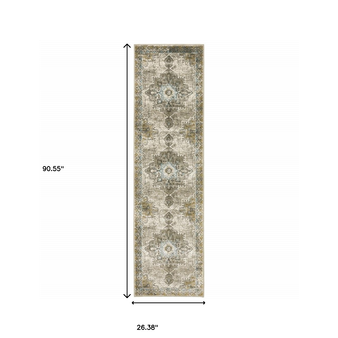 Add great coloration and comfortable texture to your space with this 2' x 8' grey blue beige and gold oriental power loom stain resistant runner rug. This runner shaped rug features a oriental design in grey blue beige and gold to give it visual interest. A classic shape marries with good looking design for your space Ideal for spaces with kids and pets, this rug is stain resistant to help repel stains and spilled liquids. Area Rugs help to give warmth and sense of home to your space. 0.31" H x 26.38" W x 90.55" D