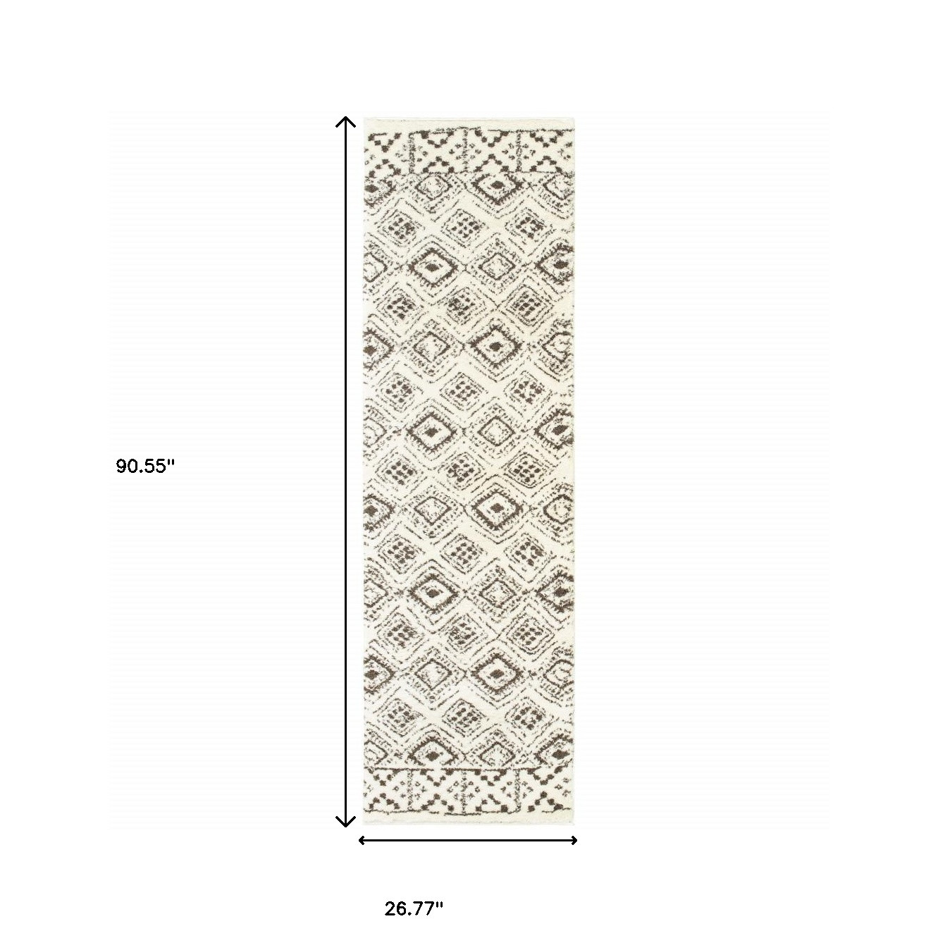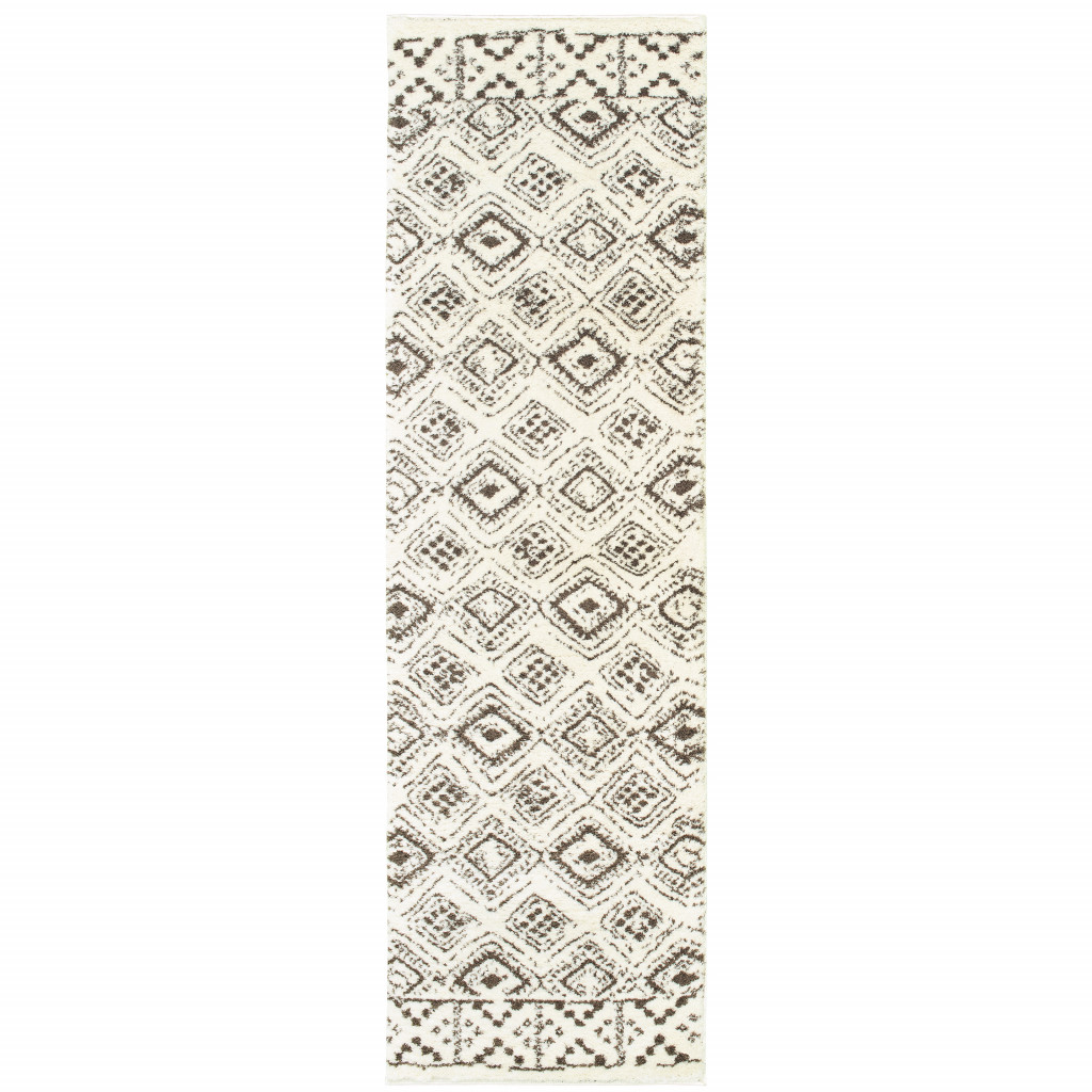 Add some artistry to your room with this 2' x 8' ivory and brown geometric shag power loom stain resistant runner rug. This runner shaped rug features a geometric design in ivory and brown to give it visual interest. A classic shape marries with good looking design for your space Ideal for spaces with kids and pets, this rug is stain resistant to help repel stains and spilled liquids. The retro shag construction of this luxurious rug will provide a soft and comfortable barrier to color tile and hardwood floors. Area Rugs help to give warmth and sense of home to your space. 0.98" H x 26.77" W x 90.55" D