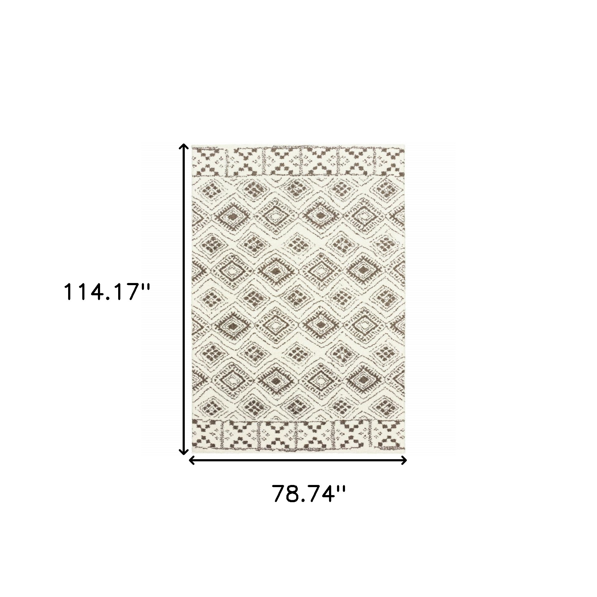 Add great coloration and comfortable texture to your space with this 7-foot x 10-foot ivory and brown geometric shag area rug. Ideal for spaces with kids and pets, this rug is stain resistant to help repel dirt and spilled liquids. Built to last, this rug crafted from polyester fibers is known for its durability and long lasting appeal. Rugs are a great way to showcase your style, hide imperfections, warm your home and reduce noise. The retro shag construction of this luxurious rug will provide a soft and comfortable barrier to color tile and hardwood floors. 78.74-inch h x 114.17-inch w x 0.98-inch d.