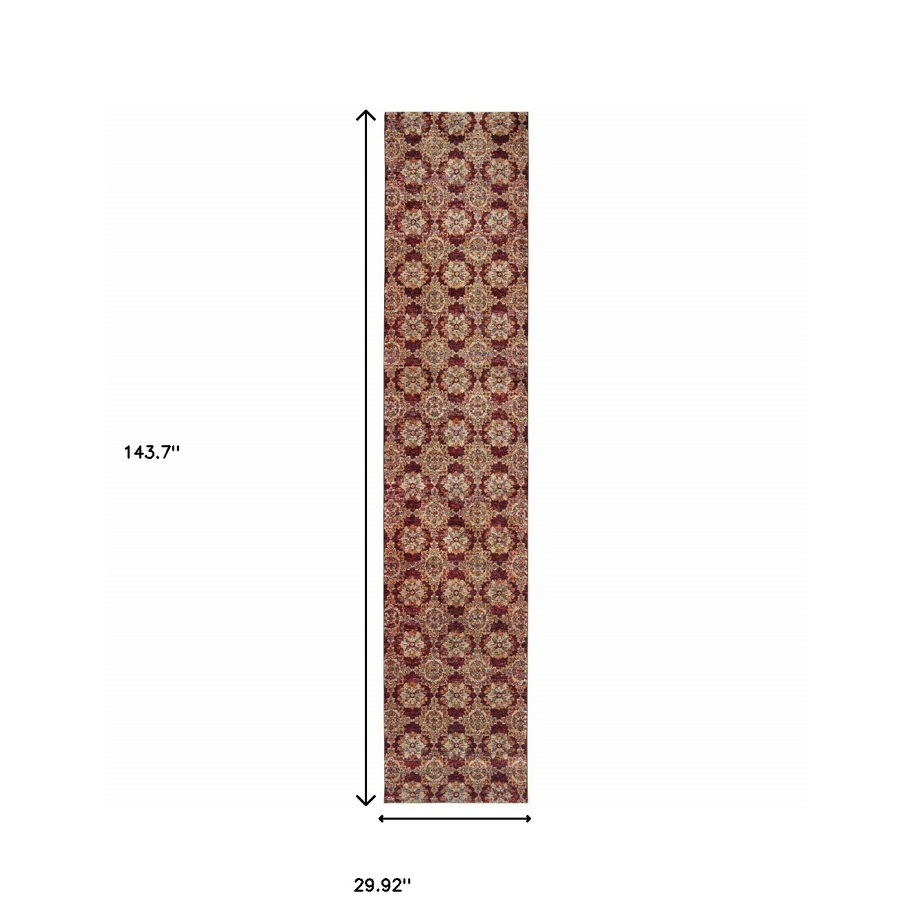 Set an inviting tone in your space with this 12-foot red and gold oriental runner rug. Ideal for spaces with kids and pets, this rug is stain resistant to help repel dirt and spilled liquids. Built to last, this rug crafted from polypropylene and nylon fibers is known for its durability and long lasting appeal. Rugs are a great way to showcase your style, hide imperfections, warm your home and reduce noise. This rectangular shaped rug features a abstract design that will add a functional and decorative accent to your space. 29.92-inch h x 143.7-inch w x 0.55-inch d.