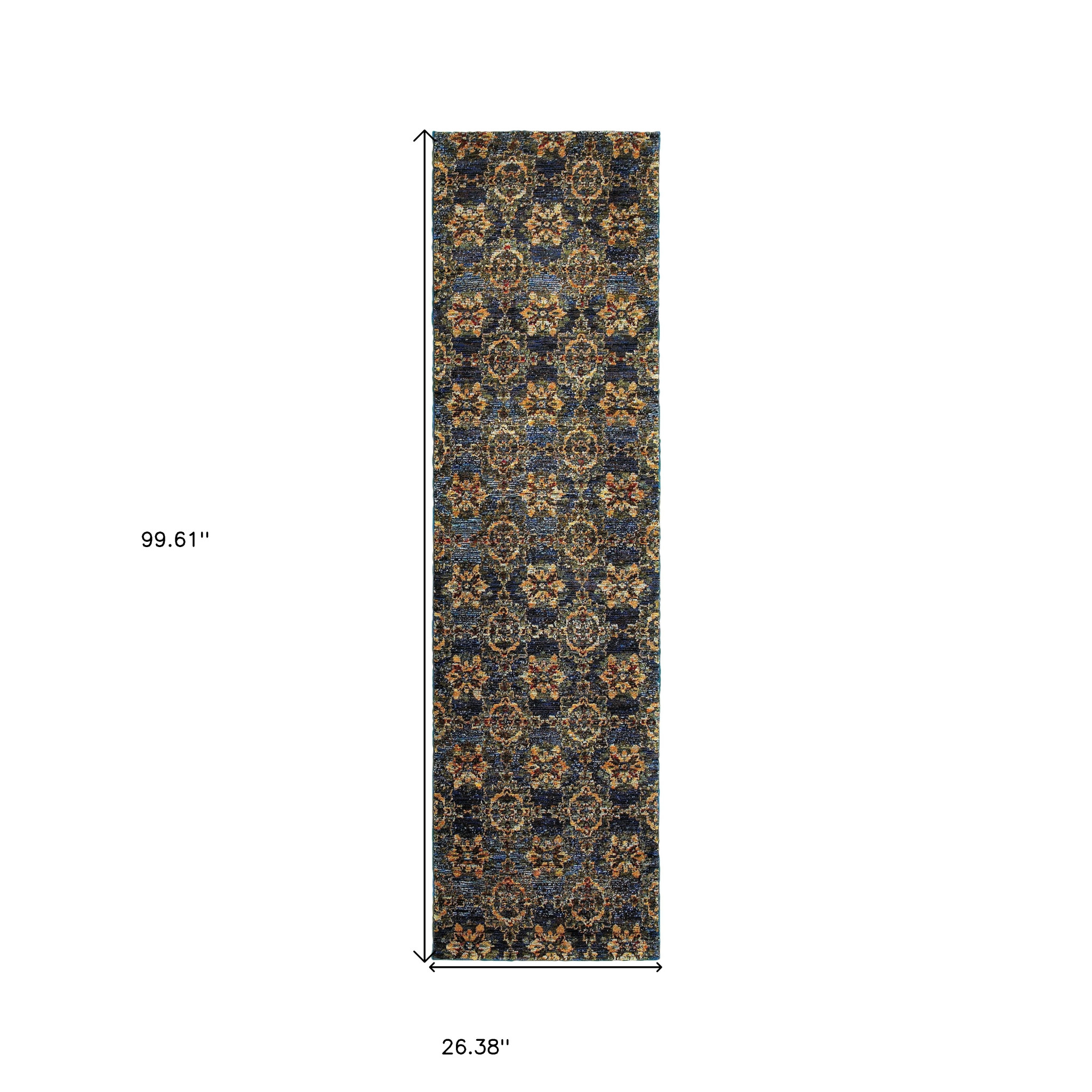 This 8-foot blue and gold oriental runner rug, is a great way to add warmth to a room. Ideal for spaces with kids and pets, this rug is stain resistant to help repel dirt and spilled liquids. Built to last, this rug crafted from polypropylene and nylon fibers is known for its durability and long lasting appeal. Rugs are a great way to showcase your style, hide imperfections, warm your home and reduce noise. This rectangular shaped rug features a abstract design that will add a functional and decorative accent to your space. 26.38-inch h x 99.61-inch w x 0.55-inch d.