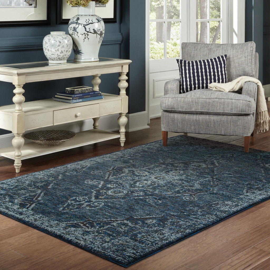 Set an inviting tone in your space with this 2-foot x 3-foot midnight and light blue oriental area rug. Ideal for spaces with kids and pets, this rug is stain resistant to help repel dirt and spilled liquids. Built to last, this rug crafted from polypropylene and nylon fibers is known for its durability and long lasting appeal. Rugs are a great way to showcase your style, hide imperfections, warm your home and reduce noise. 22.83-inch h x 39.37-inch w x 0.55-inch d.