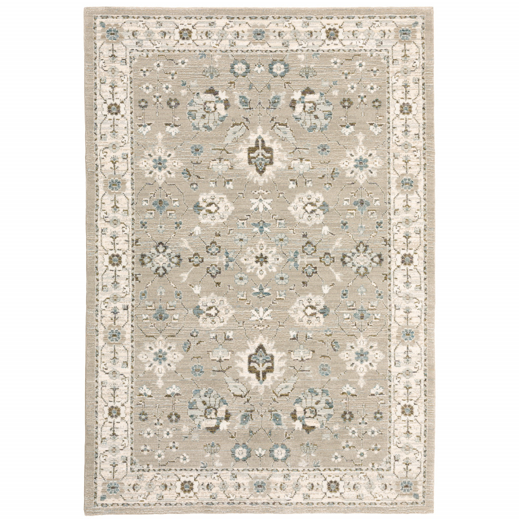 This 5-foot x 7-foot beige and ivory oriental power loom area rug, is a great way to add warmth to a room. This rectangle shaped rug features a oriental design in beige and ivory to give it visual interest. A classic shape marries with good looking design for your space ideal for spaces with kids and pets, this rug is stain resistant to help repel stains and spilled liquids. Place this area rug against a hardwood or tile floor and it will enliven your living space with style and sophistication. 62.99-inch H x 90.55-inch W x 0.55-inch D