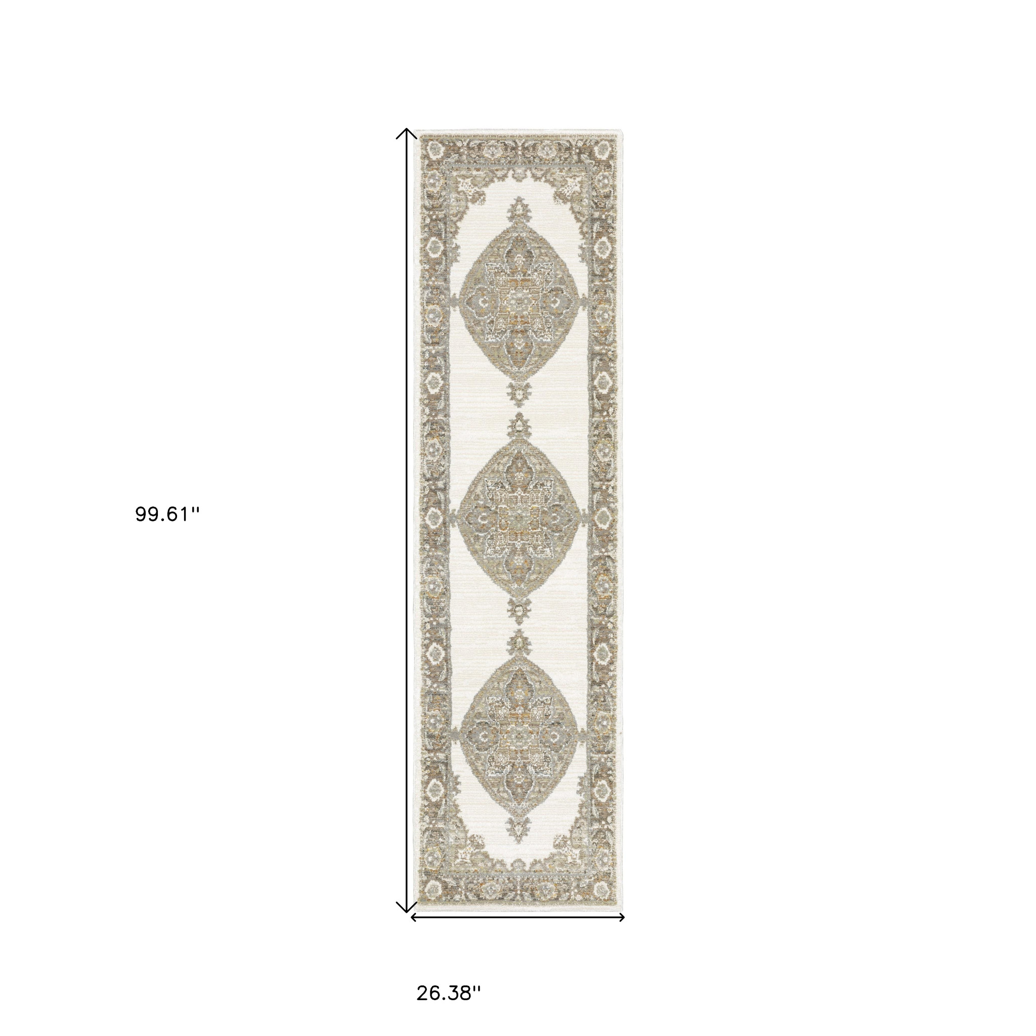 Add great coloration and comfortable texture to your space with this 8-foot beige and ivory oriental runner rug. Ideal for spaces with kids and pets, this rug is stain resistant to help repel dirt and spilled liquids. Built to last, this rug crafted from polypropylene and nylon fibers is known for its durability and long lasting appeal. Rugs are a great way to showcase your style, hide imperfections, warm your home and reduce noise. 26.38-inch h x 99.61-inch w x 0.55-inch d.