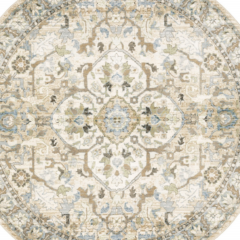 Set an inviting tone in your space with this 8-foot beige and ivory round oriental power loom area rug. This geometric round shaped rug features a oriental pattern in beige and ivory that combines a good looking print with a unique and updated shape. The mix of shape, color, and design gives this rug refreshing visual interest. Ideal for spaces with kids and pets, this rug is stain resistant to help repel stains and spilled liquids. Place this area rug against a hardwood or tile floor and it will enliven your living space with style and sophistication. 94.49-inch H x 94.49-inch W x 0.55-inch D