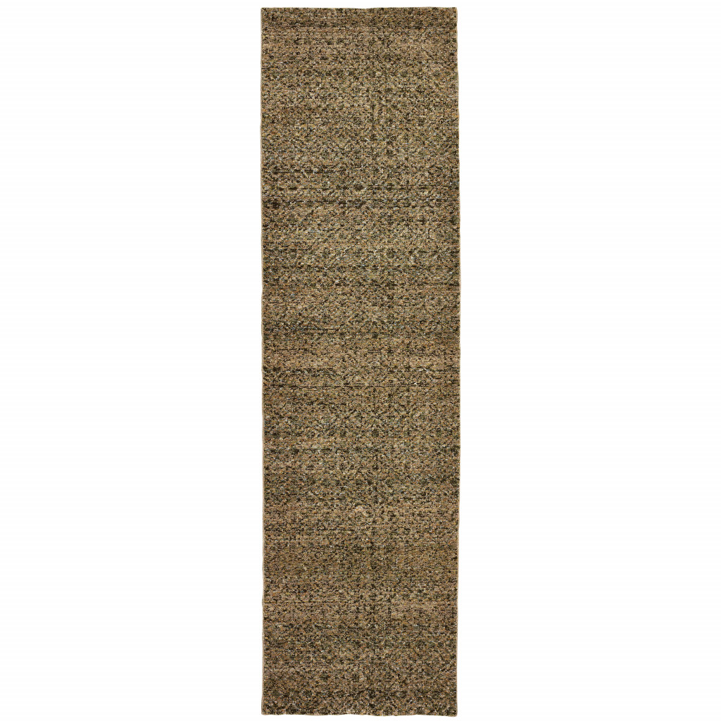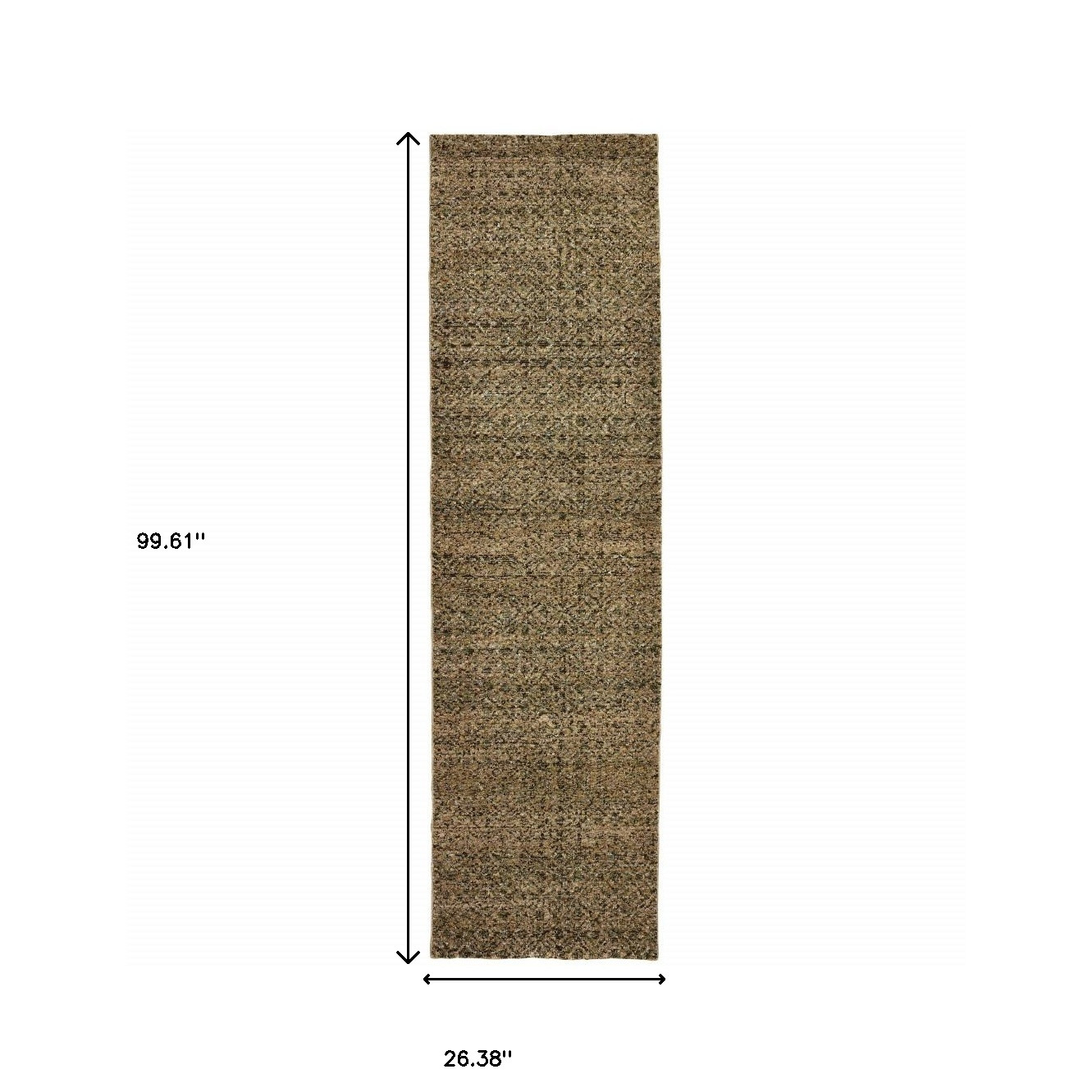 Add great coloration and comfortable texture to your space with this 8-foot green and gold geometric distressed runner rug. Ideal for spaces with kids and pets, this rug is stain resistant to help repel dirt and spilled liquids. Built to last, this rug crafted from nylon and polypropylene fibers is known for its durability and long lasting appeal. Rugs are a great way to showcase your style, hide imperfections, warm your home and reduce noise. 26.38-inch h x 99.61-inch w x 0.55-inch d.
