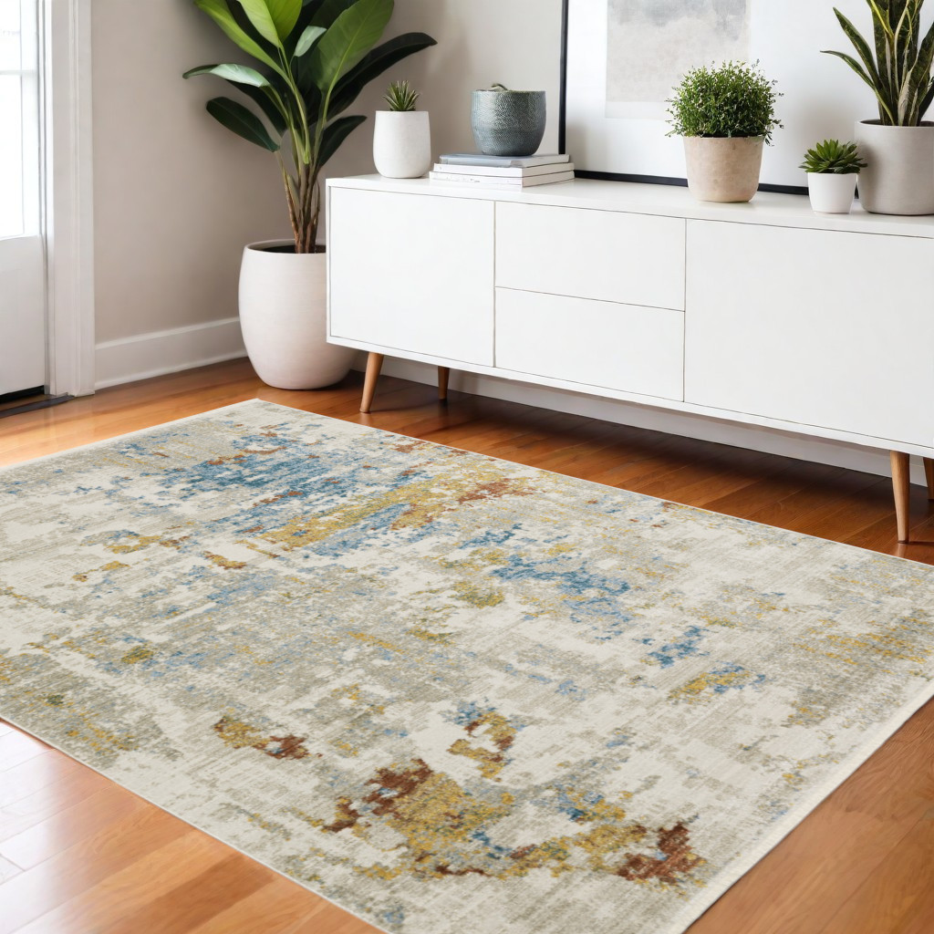 Add great coloration and comfortable texture to your space with this 4' x 6' beige grey gold blue rust and teal abstract power loom stain resistant area rug with fringe. This rectangle shaped rug features a abstract design in beige grey gold blue rust and teal to give it visual interest. A classic shape marries with good looking design for your space Ideal for spaces with kids and pets, this rug is stain resistant to help repel stains and spilled liquids. Tassel ends bring a timeless and fashionable look to your interior. Place this area rug against a hardwood or tile floor and it will enliven your living space with style and sophistication. 0.31" H x 46.06" W x 64.96" D