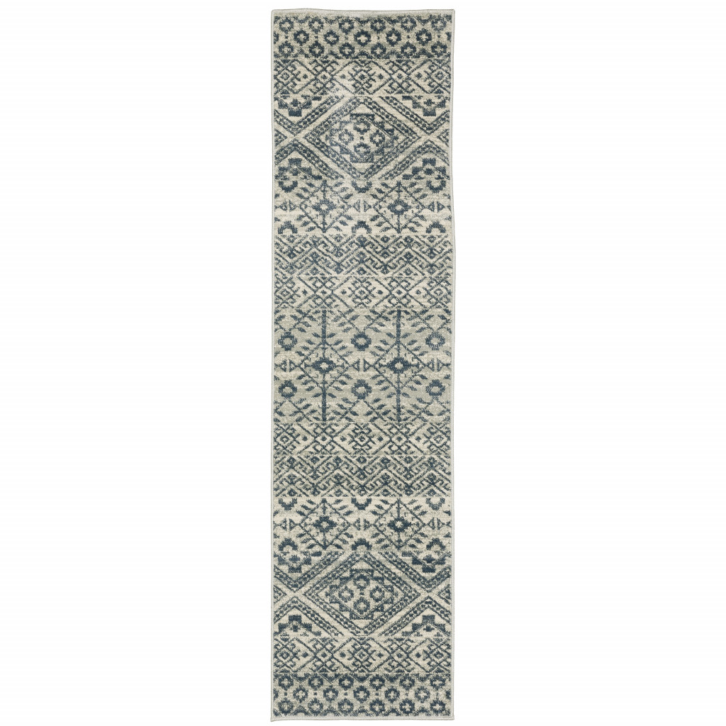 This 2' x 8' blue and beige geometric power loom stain resistant runner rug, is a great way to add warmth to a room. This runner shaped rug features a geometric design in blue and beige to give it visual interest. A classic shape marries with good looking design for your space Ideal for spaces with kids and pets, this rug is stain resistant to help repel stains and spilled liquids. Place this area rug against a hardwood or tile floor and it will enliven your living space with style and sophistication. 0.39" H x 22.83" W x 86.61" D