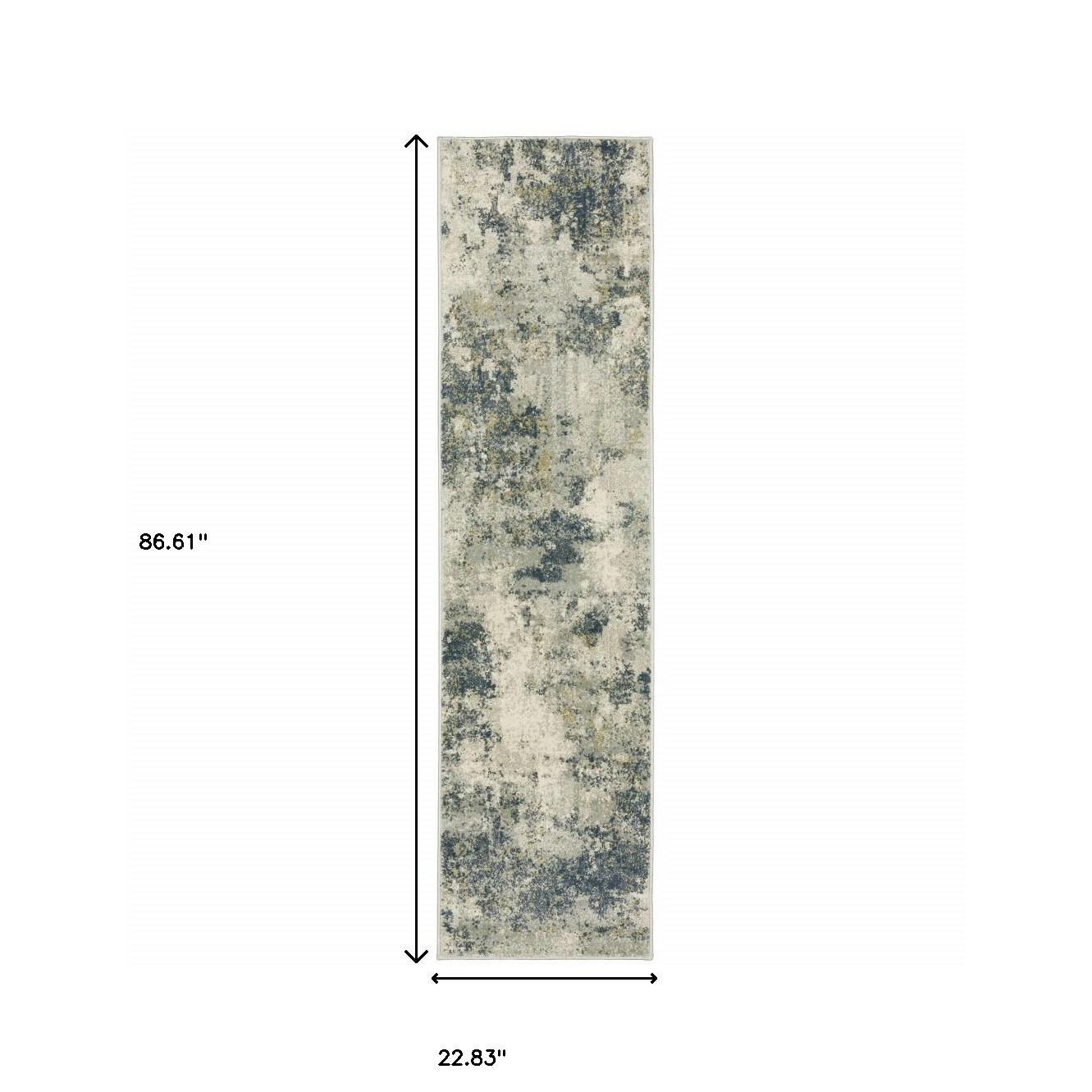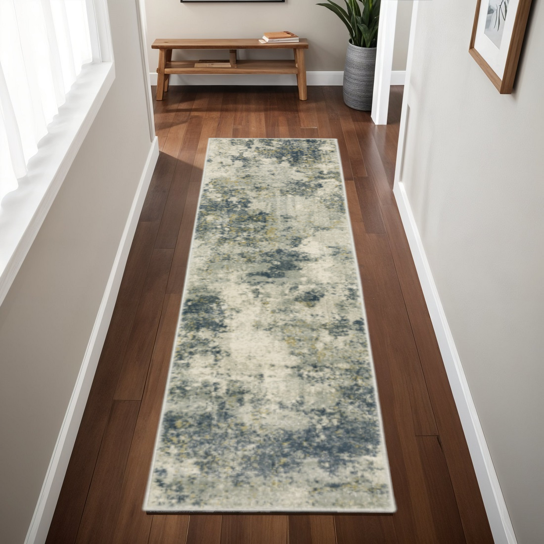 Add some artistry to your room with this 2' x 8' beige teal grey and gold abstract power loom stain resistant runner rug. This runner shaped rug features a abstract design in beige teal grey and gold to give it visual interest. A classic shape marries with good looking design for your space Ideal for spaces with kids and pets, this rug is stain resistant to help repel stains and spilled liquids. Area Rugs help to give warmth and sense of home to your space. 0.39" H x 22.83" W x 86.61" D