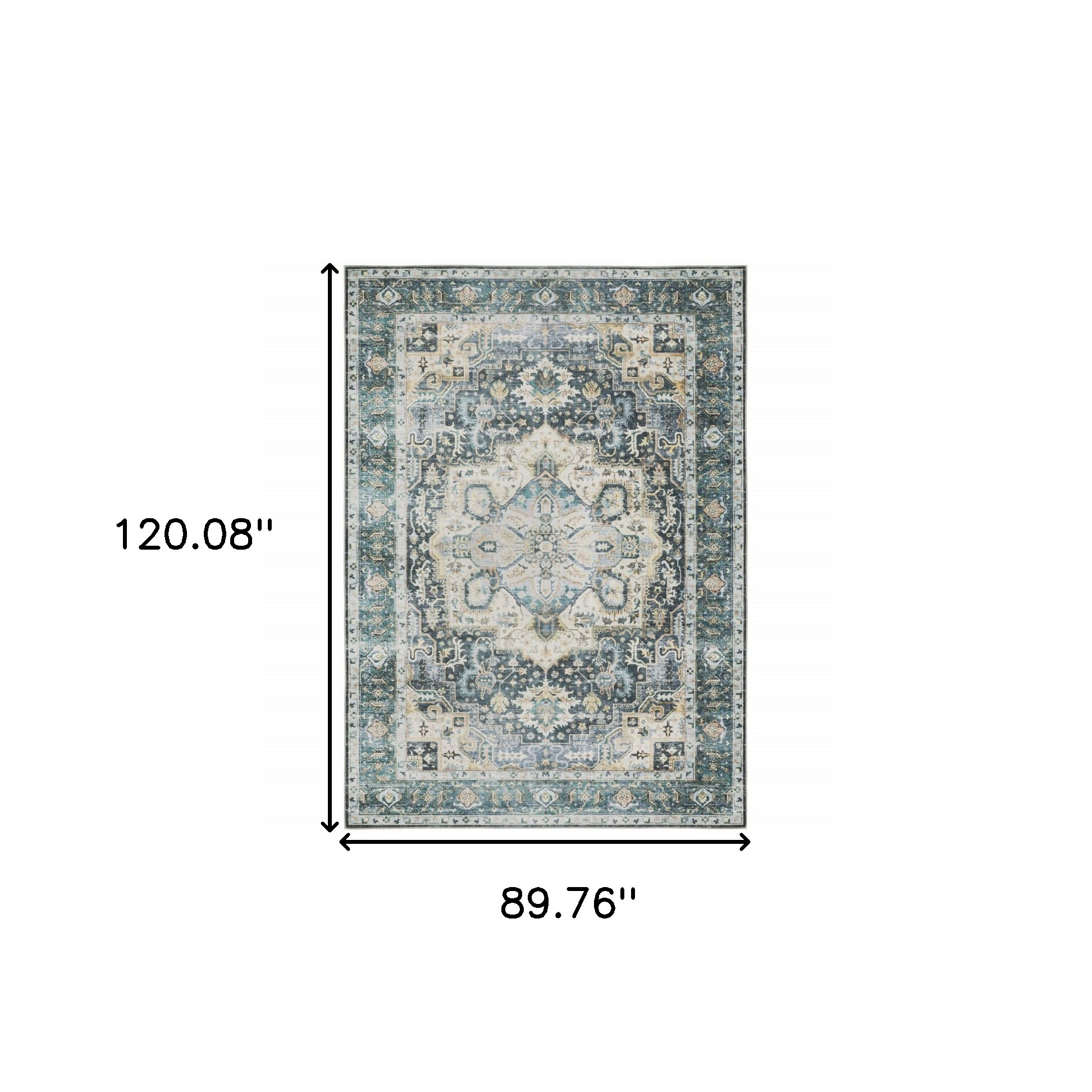 Add some artistry to your room with this 7-foot x 10-foot blue and ivory oriental non skid area rug. This rectangle shaped rug features a oriental design in blue and ivory to give it visual interest. A classic shape marries with good looking design for your space ideal for spaces with kids and pets, this rug is stain resistant to help repel stains and spilled liquids. 89.76-inch H x 120.08-inch W x 0.12-inch D