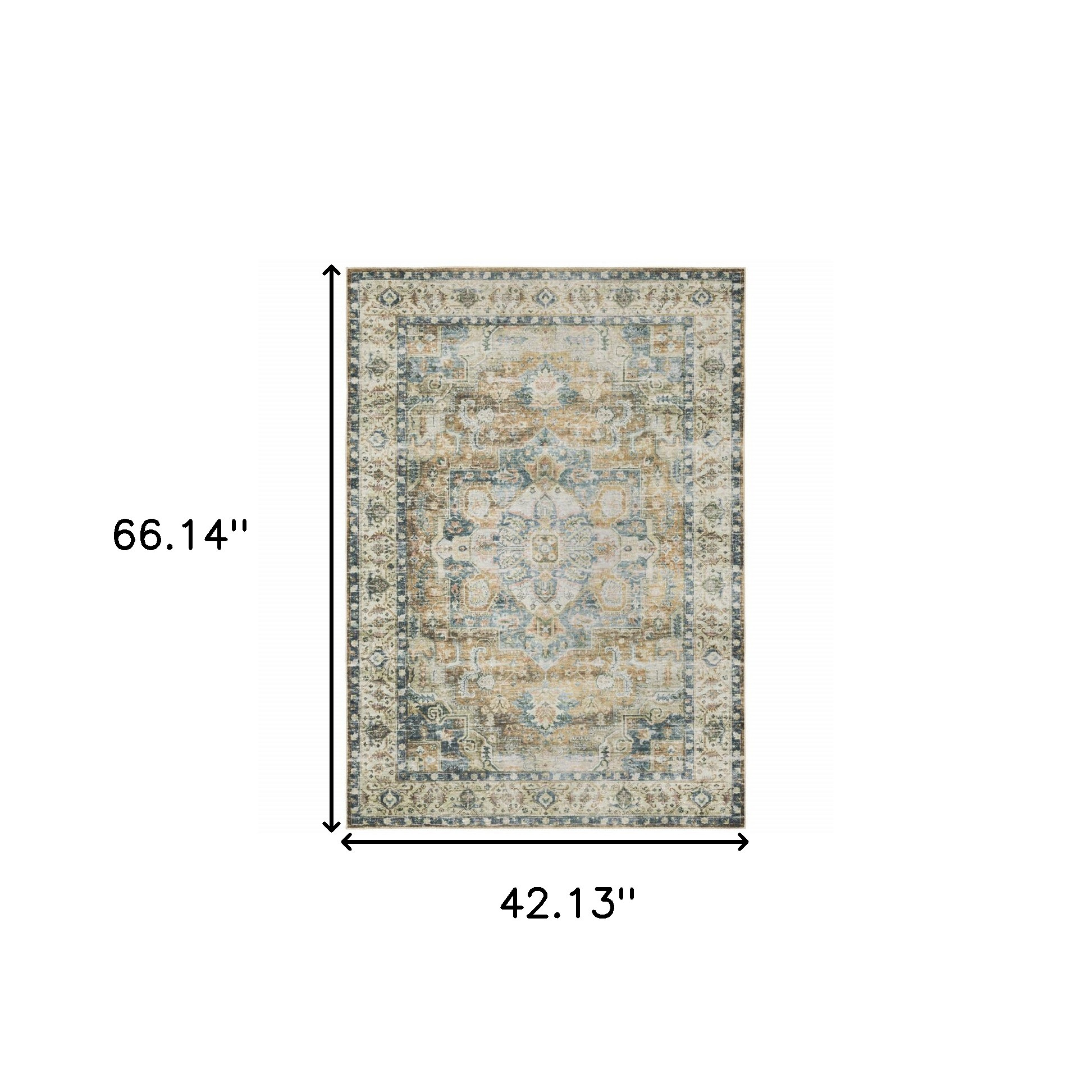 This 4-foot x 6-foot blue and gold oriental non skid area rug, is a great way to add warmth to a room. This rectangle shaped rug features a oriental design in blue and gold to give it visual interest. A classic shape marries with good looking design for your space ideal for spaces with kids and pets, this rug is stain resistant to help repel stains and spilled liquids. 42.13-inch H x 66.14-inch W x 0.12-inch D