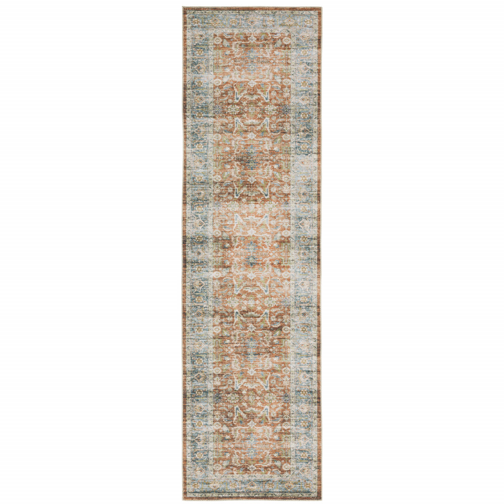 Add some artistry to your room with this 8-foot rust and blue oriental distressed runner rug. Ideal for spaces with kids and pets, this rug is stain resistant to help repel dirt and spilled liquids. Built to last, this rug crafted from polyester fibers is known for its durability and long lasting appeal. Rugs are a great way to showcase your style, hide imperfections, warm your home and reduce noise. 24.02-inch h x 96.06-inch w x 0.12-inch d.