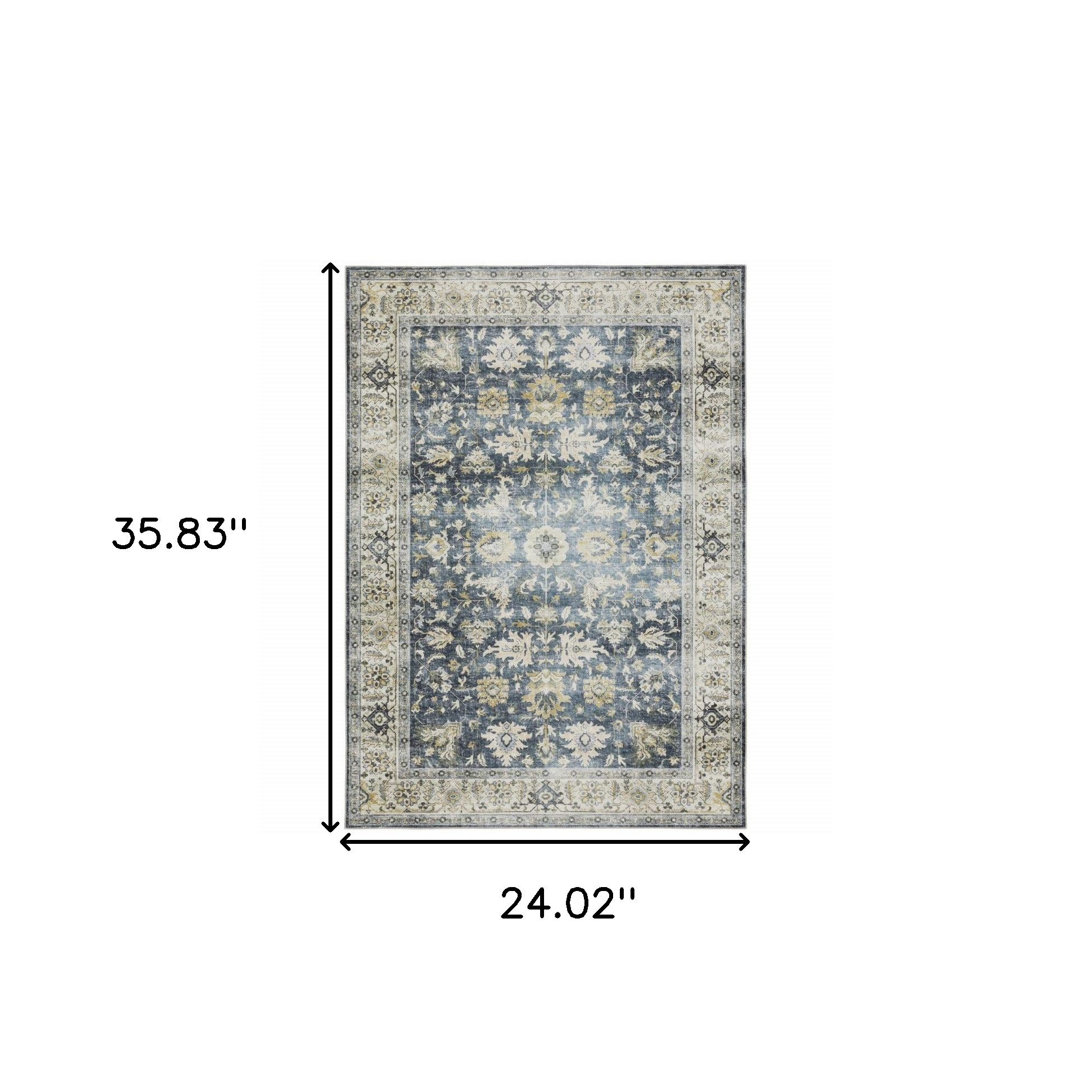 Add some artistry to your room with this 2-foot x 3-foot blue and gold oriental distressed area rug. Ideal for spaces with kids and pets, this rug is stain resistant to help repel dirt and spilled liquids. Built to last, this rug crafted from polyester fibers is known for its durability and long lasting appeal. Rugs are a great way to showcase your style, hide imperfections, warm your home and reduce noise. 24.02-inch h x 35.83-inch w x 0.12-inch d.