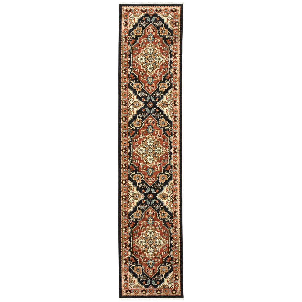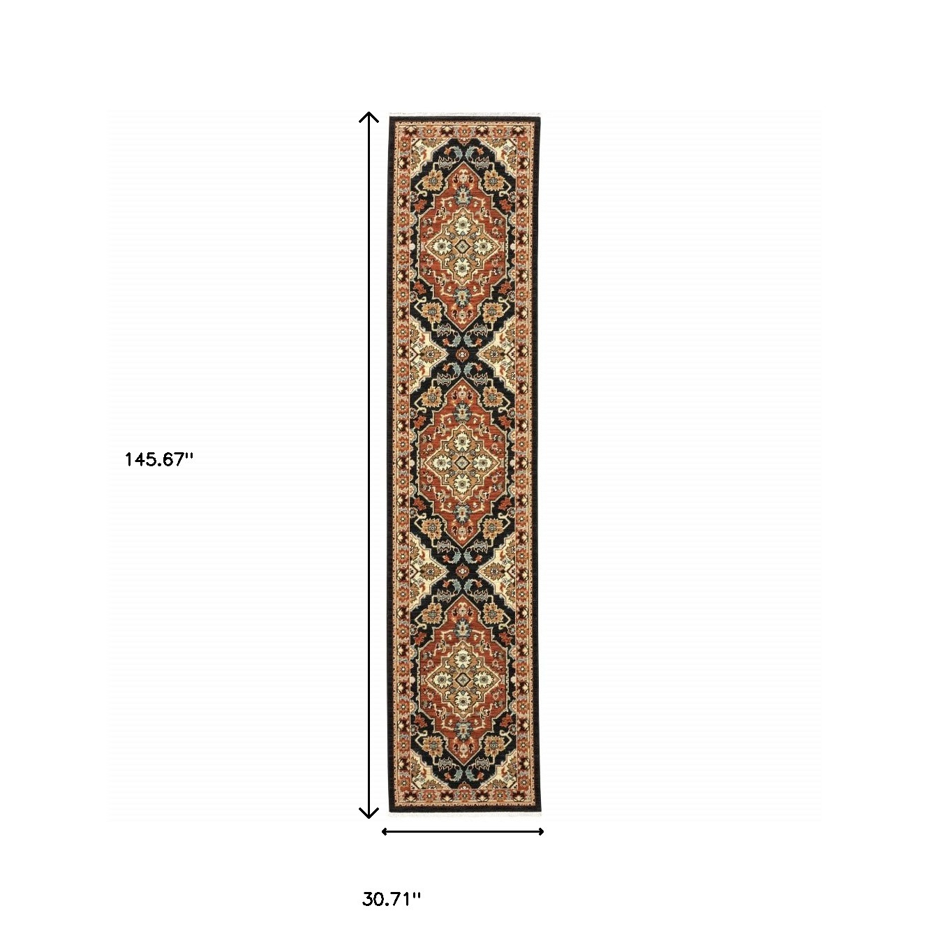 Add some artistry to your room with this 12' red and black oriental power loom runner rug with fringe. This runner shaped rug features a oriental design in red and black to give it visual interest. A classic shape marries with good looking design for your space Ideal for spaces with kids and pets, this rug is stain resistant to help repel stains and spilled liquids. Tassel ends bring a timeless and fashionable look to your interior. Area Rugs help to give warmth and sense of home to your space. 0.31" H x 30.71" W x 145.67" D