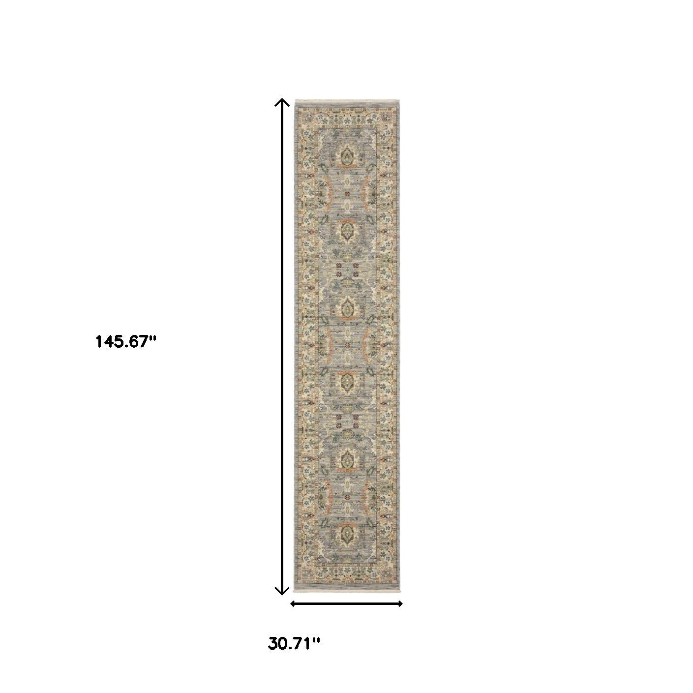 12' Gray And Ivory Genuine Wool Oriental Runner Rug With Fringe