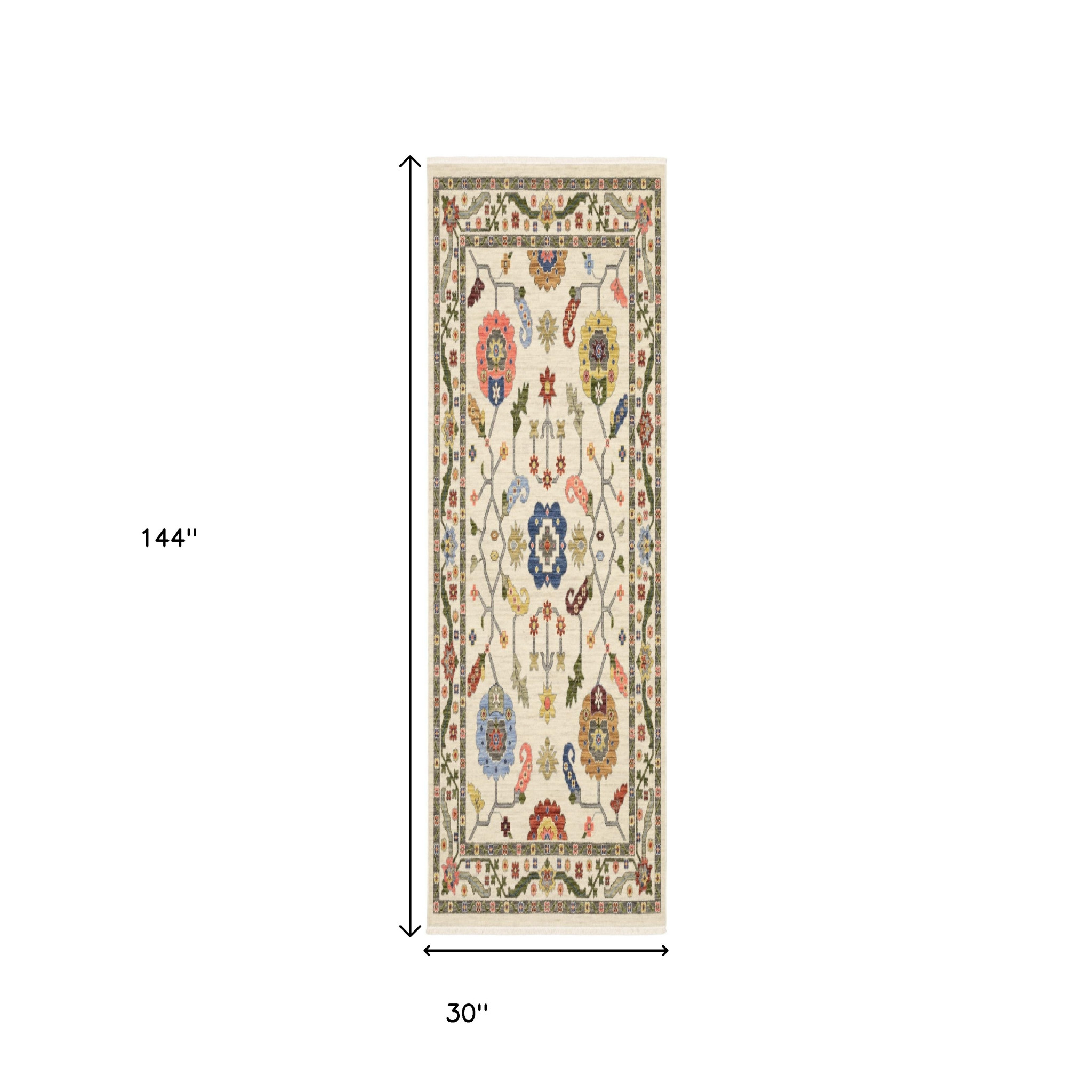 This 12-foot ivory gray and red oriental runner rug, is a great way to add warmth to a room. Ideal for spaces with kids and pets, this rug is stain resistant to help repel dirt and spilled liquids. Built to last, this rug crafted from wool and nylon fibers is known for its durability and long lasting appeal. Rugs are a great way to showcase your style, hide imperfections, warm your home and reduce noise. 30-inch h x 144-inch w x 0.31-inch d.
