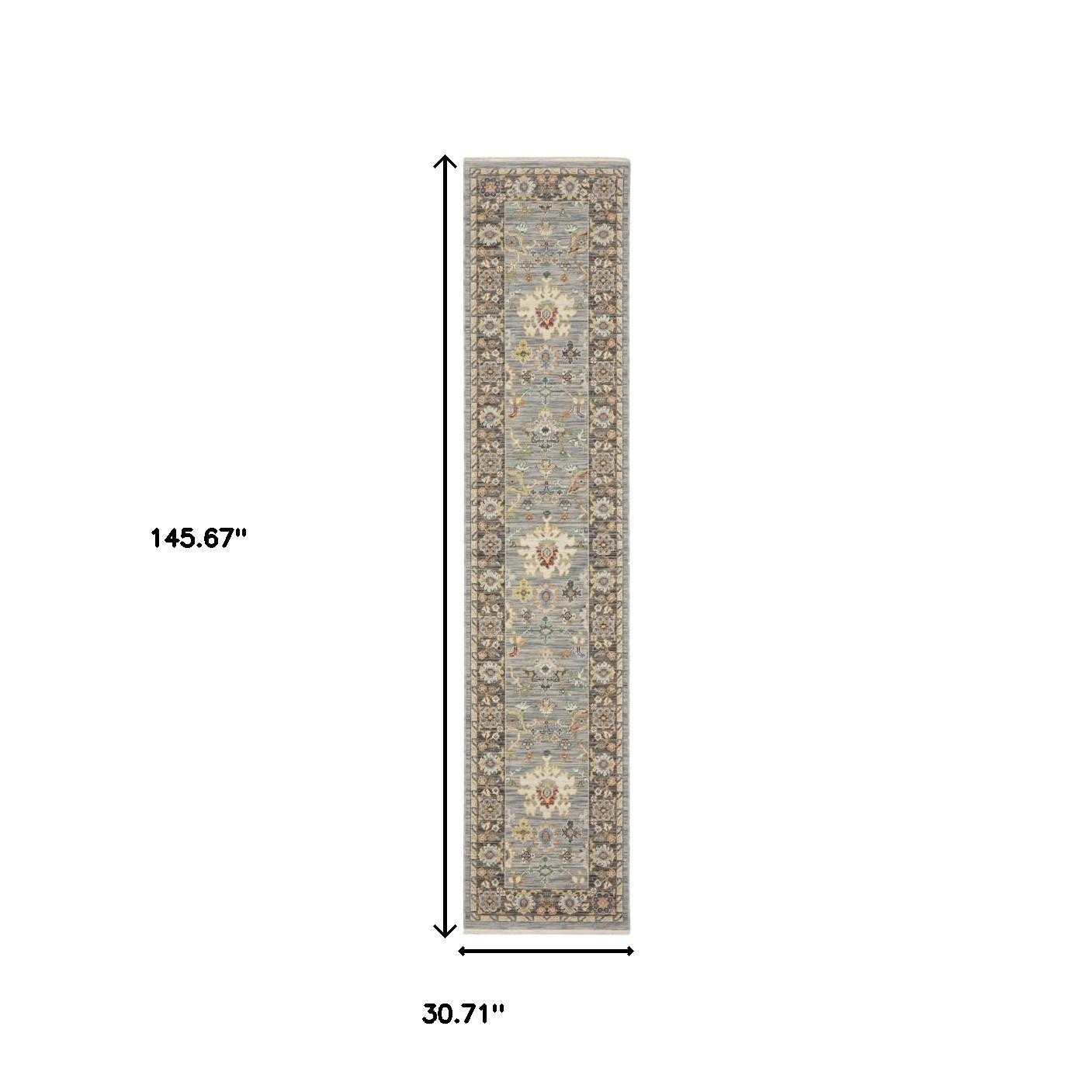Add some artistry to your room with this 12-foot blue and gray genuine wool oriental runner rug with fringe. Ideal for spaces with kids and pets, this rug is stain resistant to help repel dirt and spilled liquids. Crafted from genuine wool fibers that give this piece premium texture, refinement, and appeal. Rugs are a great way to showcase your style, hide imperfections, warm your home and reduce noise. This rectangular shaped rug features a abstract design that will add a functional and decorative accent to your space. Tassel ends bring a timeless and fashionable look to your interior. 30.71-inch h x 145.67-inch w x 0.31-inch d.