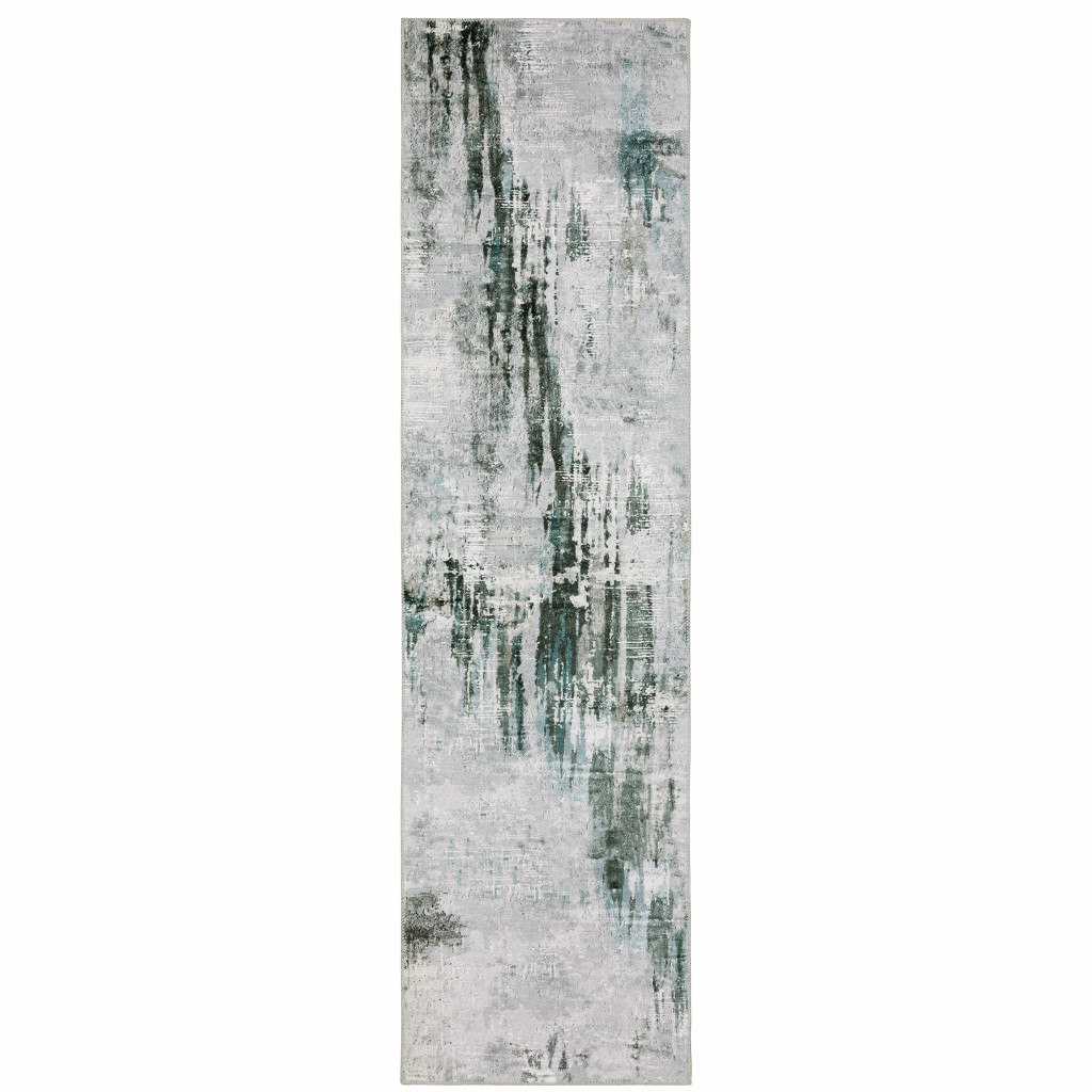 Add great coloration and comfortable texture to your space with this 2' x 8' silver grey teal blue and charcoal abstract printed stain resistant non skid runner rug. This runner shaped rug features a abstract design in silver grey teal blue and charcoal to give it visual interest. A classic shape marries with good looking design for your space Ideal for spaces with kids and pets, this rug is stain resistant to help repel stains and spilled liquids. Place this area rug against a hardwood or tile floor and it will enliven your living space with style and sophistication. 0.12" H x 24.02" W x 96.06" D