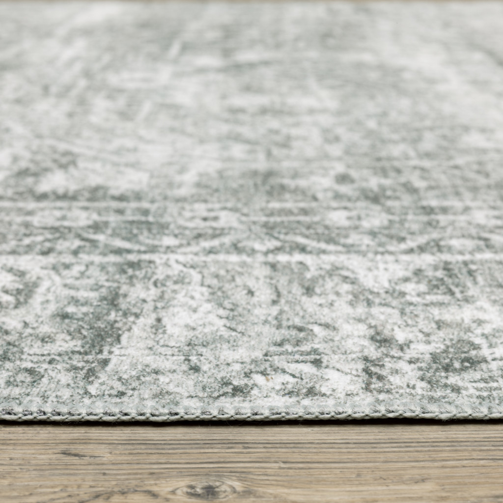 Add some artistry to your room with this 5' x 7' sage green grey ivory and silver oriental printed stain resistant non skid area rug. This rectangle shaped rug features a oriental design in sage green grey ivory and silver to give it visual interest. A classic shape marries with good looking design for your space Ideal for spaces with kids and pets, this rug is stain resistant to help repel stains and spilled liquids. Area Rugs help to give warmth and sense of home to your space. 0.12" H x 59.84" W x 83.86" D