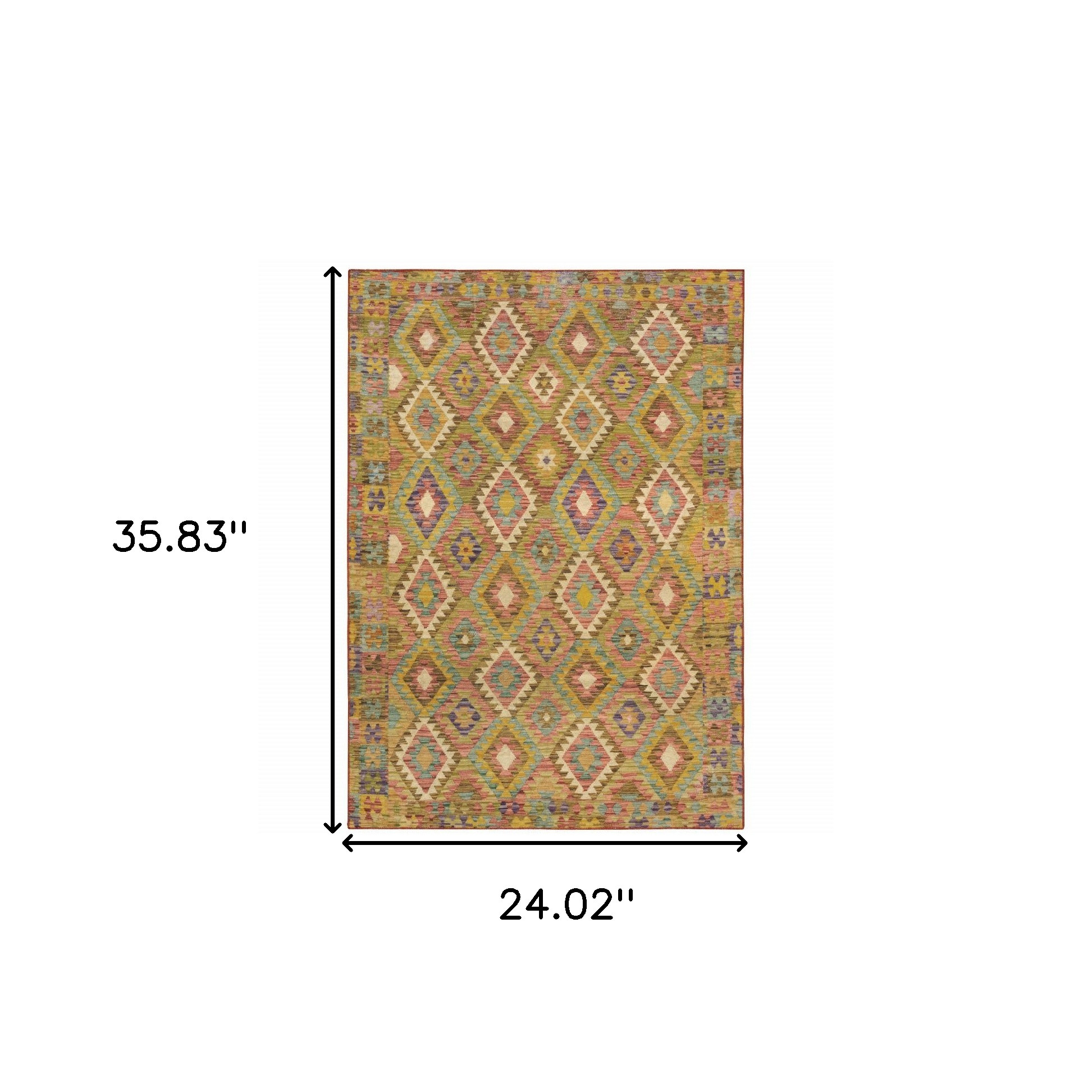 Add great coloration and comfortable texture to your space with this 2' x 3' gold orange brown red green purple and beige southwestern printed stain resistant non skid area rug. This rectangle shaped rug features a southwestern design in gold orange brown red green purple and beige to give it visual interest. A classic shape marries with good looking design for your space Ideal for spaces with kids and pets, this rug is stain resistant to help repel stains and spilled liquids. Area Rugs help to give warmth and sense of home to your space. 0.12" H x 24.02" W x 35.83" D