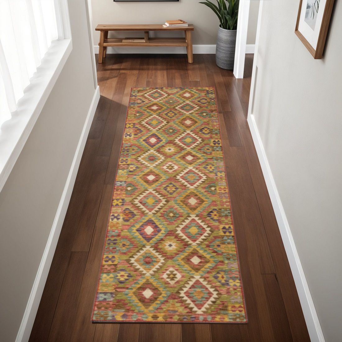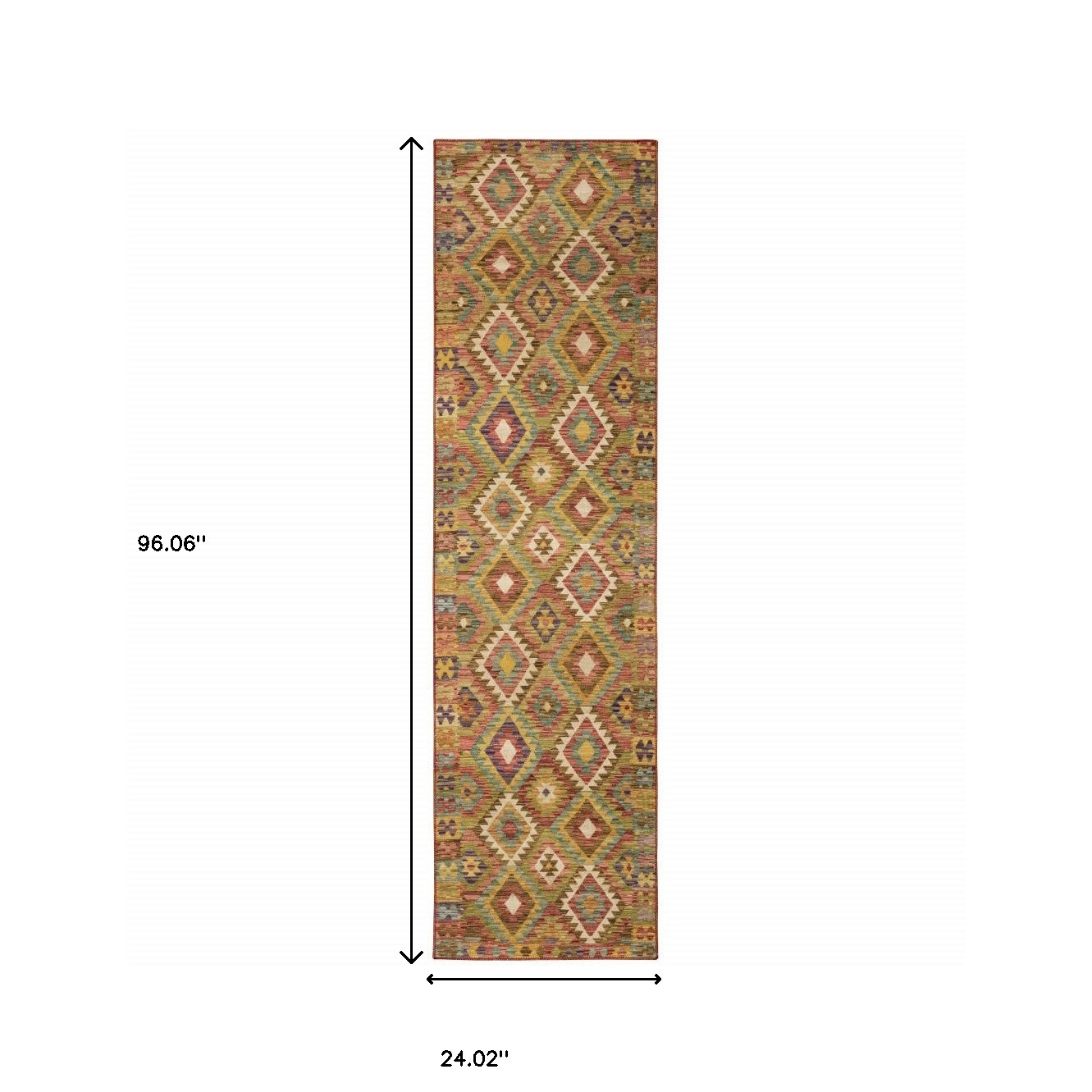 Add some artistry to your room with this 2' x 8' gold orange brown red green purple and beige southwestern printed stain resistant non skid runner rug. This runner shaped rug features a southwestern design in gold orange brown red green purple and beige to give it visual interest. A classic shape marries with good looking design for your space Ideal for spaces with kids and pets, this rug is stain resistant to help repel stains and spilled liquids. Place this area rug against a hardwood or tile floor and it will enliven your living space with style and sophistication. 0.12" H x 24.02" W x 96.06" D