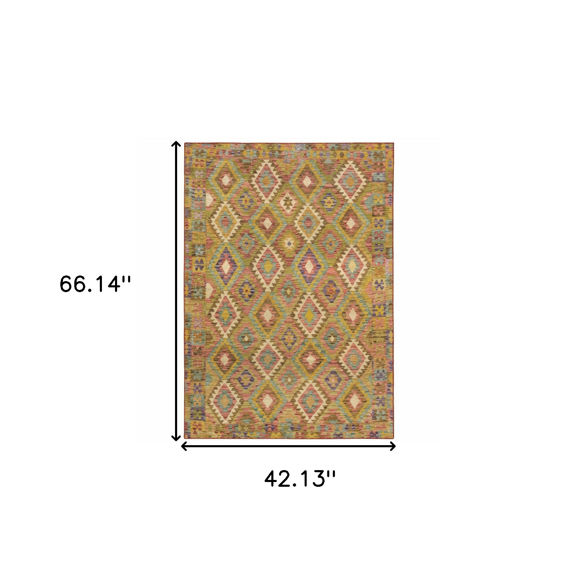 Add great coloration and comfortable texture to your space with this 4' x 6' gold orange brown red green purple and beige southwestern printed stain resistant non skid area rug. This rectangle shaped rug features a southwestern design in gold orange brown red green purple and beige to give it visual interest. A classic shape marries with good looking design for your space Ideal for spaces with kids and pets, this rug is stain resistant to help repel stains and spilled liquids. Area Rugs help to give warmth and sense of home to your space. 0.12" H x 42.13" W x 66.14" D