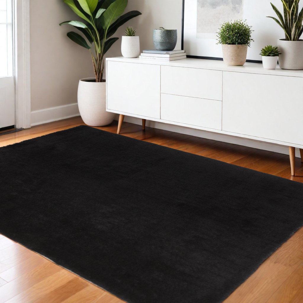 Add some artistry to your room with this 4' x 6' black shag tufted handmade area rug. This rectangle shaped rug flaunts a black color that will be a great way to accent your space. Solid colors are versatile and will blend with any existing decor style. The coloration of this rug infuses an updated and modern vibe into your space. The retro shag construction of this luxurious rug will provide a soft and comfortable barrier to color tile and hardwood floors. Area Rugs help to give warmth and sense of home to your space. 1.57" H x 42" W x 66" D