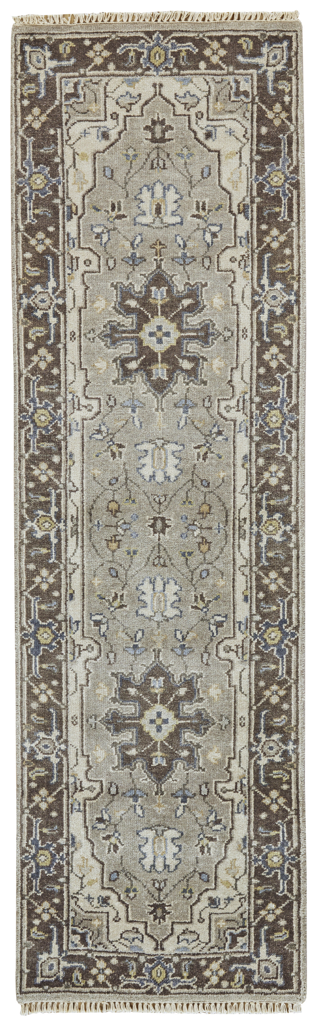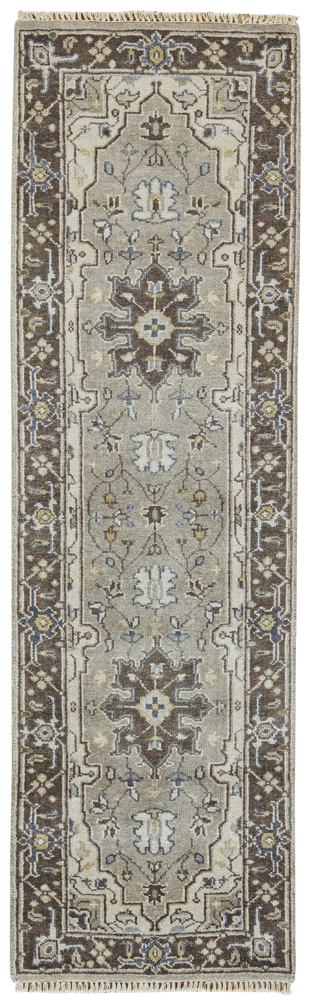 Add some artistry to your room with this 8-foot beige blue and gray medallion hand knotted runner rug with fringe. Crafted by skilled artisans, this hand knotted rug is genuine and unique. No two will be exactly alike. Crafted from wool blend fibers that give this piece premium texture, refinement, and appeal. This runner shaped rug features a medallion design that will add a functional and decorative accent to your space. Ideal for spaces with kids and pets, this rug is stain resistant to help repel dirt and spilled liquids. Tassel ends bring a timeless and fashionable look to your interior. This smaller sized rug is just what you need for your walkway, or in front of door, cabinet, refrigerator, or chair. 30-inch h x 96-inch w x 0.37-inch d