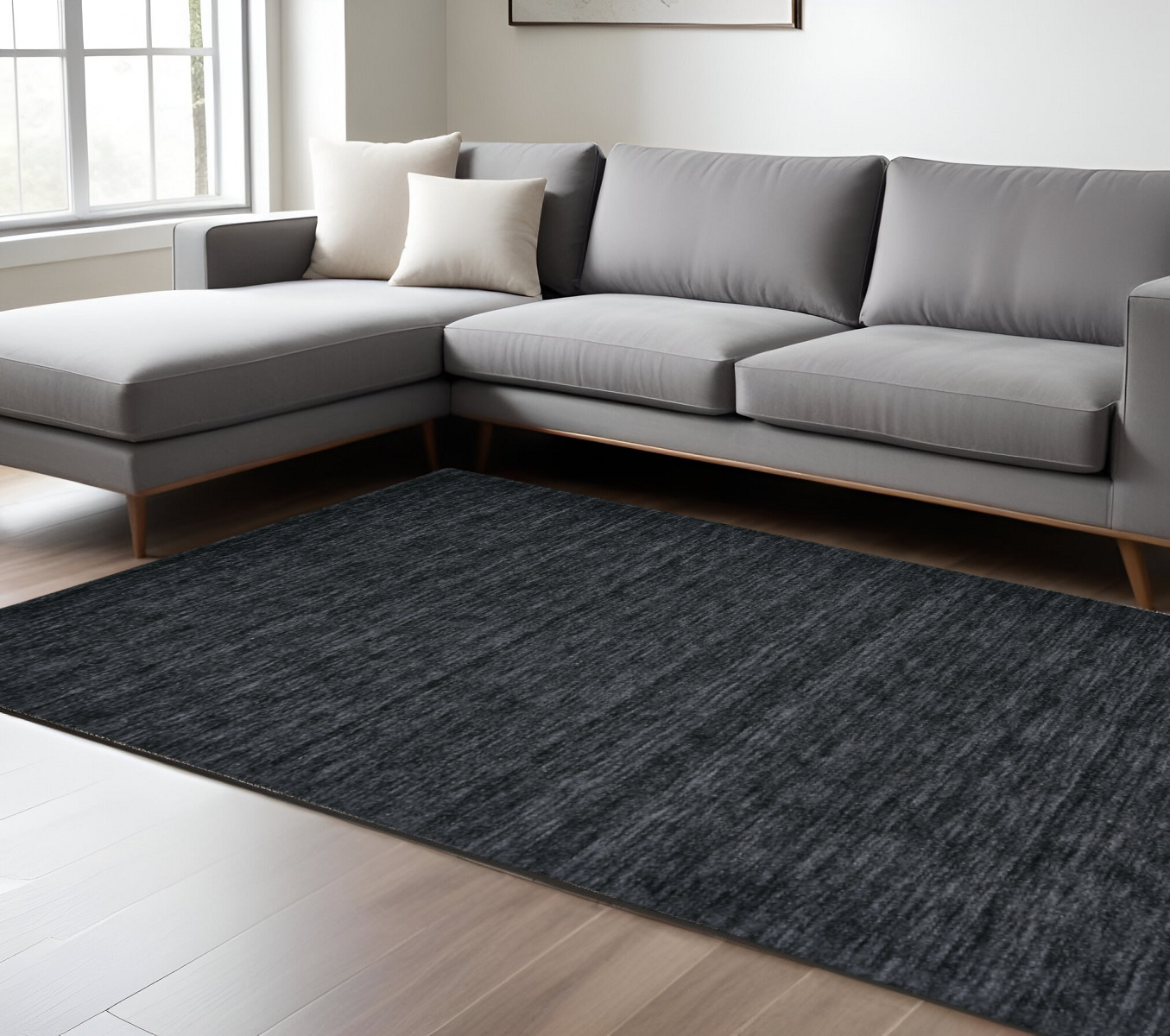 Add some artistry to your room with this 10-foot x 13-foot black wool hand woven area rug. This rectangle shaped rug flaunts a black color that will be a great way to accent your space. Solid colors are versatile and will blend with any existing decor style. The coloration of this rug infuses an updated and modern vibe into your space. Ideal for spaces with kids and pets, this rug is stain resistant to help repel stains and spilled liquids. Crafted by skilled artisans, this hand woven rug is genuine and unique. No two will be exactly alike. Area rugs help to give warmth and sense of home to your space. 114-inch H x 162-inch W x 0.52-inch D