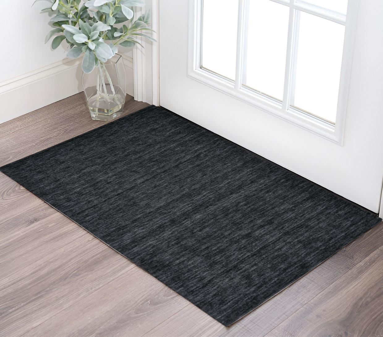 Set an inviting tone in your space with this 2-foot x 3-foot black wool hand woven area rug. This rectangle shaped rug flaunts a black color that will be a great way to accent your space. Solid colors are versatile and will blend with any existing decor style. The coloration of this rug infuses an updated and modern vibe into your space. Ideal for spaces with kids and pets, this rug is stain resistant to help repel stains and spilled liquids. Crafted by skilled artisans, this hand woven rug is genuine and unique. No two will be exactly alike. Place this area rug against a hardwood or tile floor and it will enliven your living space with style and sophistication. 24-inch H x 36-inch W x 0.52-inch D