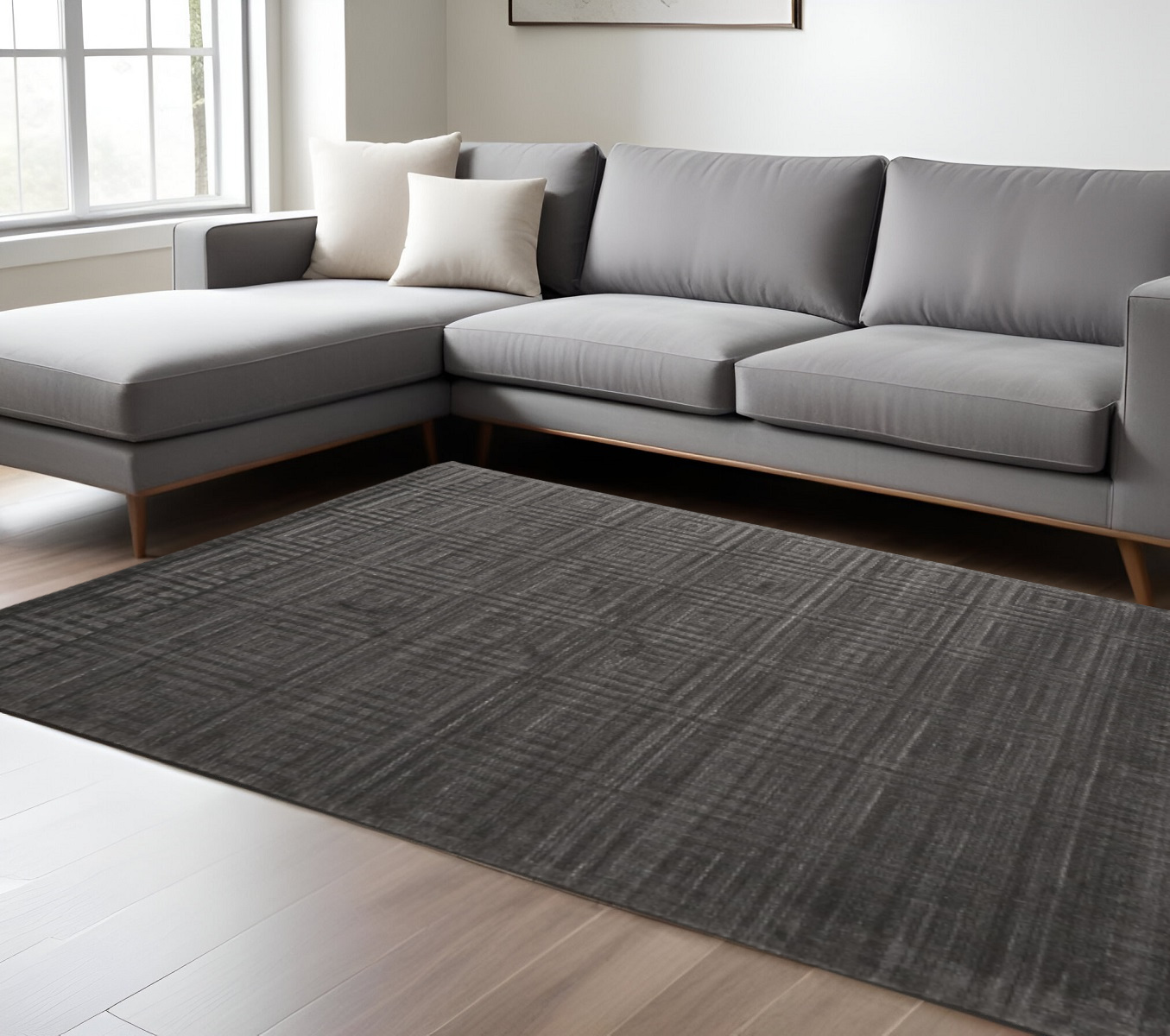 Add great coloration and comfortable texture to your space with this 5' x 8' gray geometric hand woven area rug. This rectangle shaped rug features a geometric design in gray to give it visual interest. A classic shape marries with good looking design for your space Crafted by skilled artisans, this hand woven rug is genuine and unique. No two will be exactly alike. Place this area rug against a hardwood or tile floor and it will enliven your living space with style and sophistication. 0.39" H x 66" W x 102" D