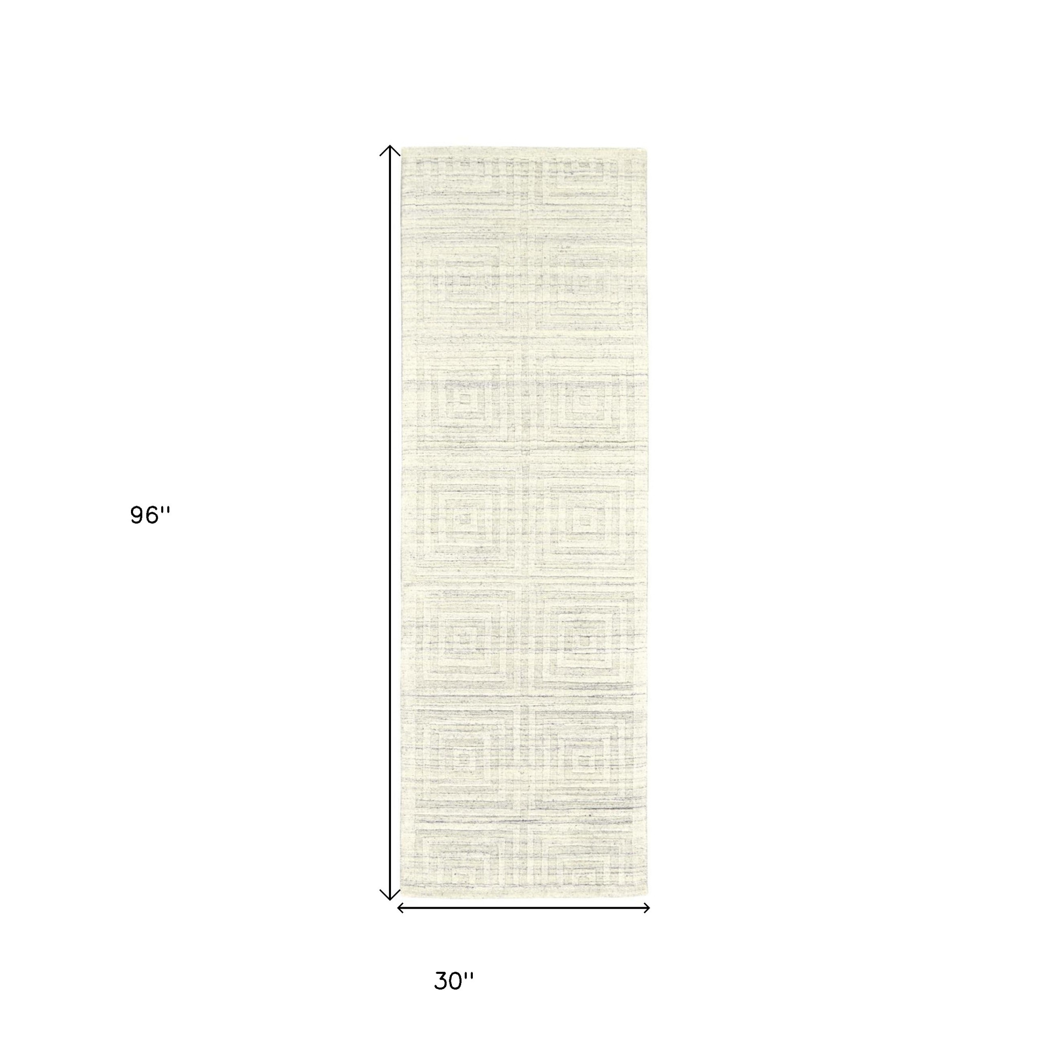Add great coloration and comfortable texture to your space with this 8' ivory geometric hand woven runner rug. This runner shaped rug features a geometric design in ivory to give it visual interest. A classic shape marries with good looking design for your space Crafted by skilled artisans, this hand woven rug is genuine and unique. No two will be exactly alike. Place this area rug against a hardwood or tile floor and it will enliven your living space with style and sophistication. 0.39" H x 30" W x 96" D
