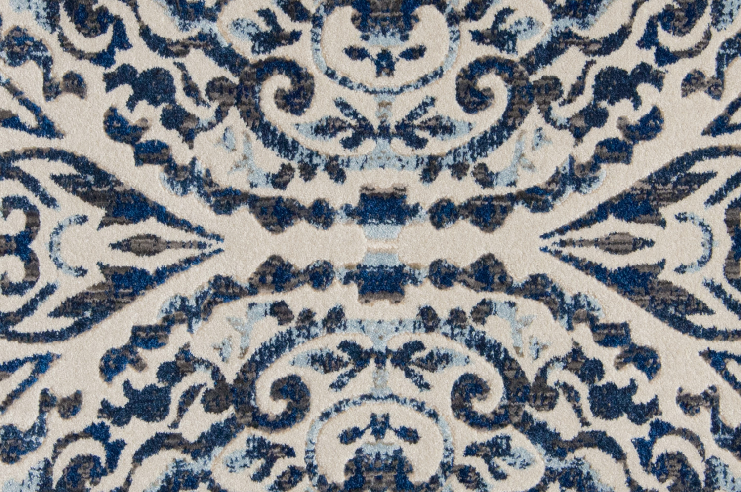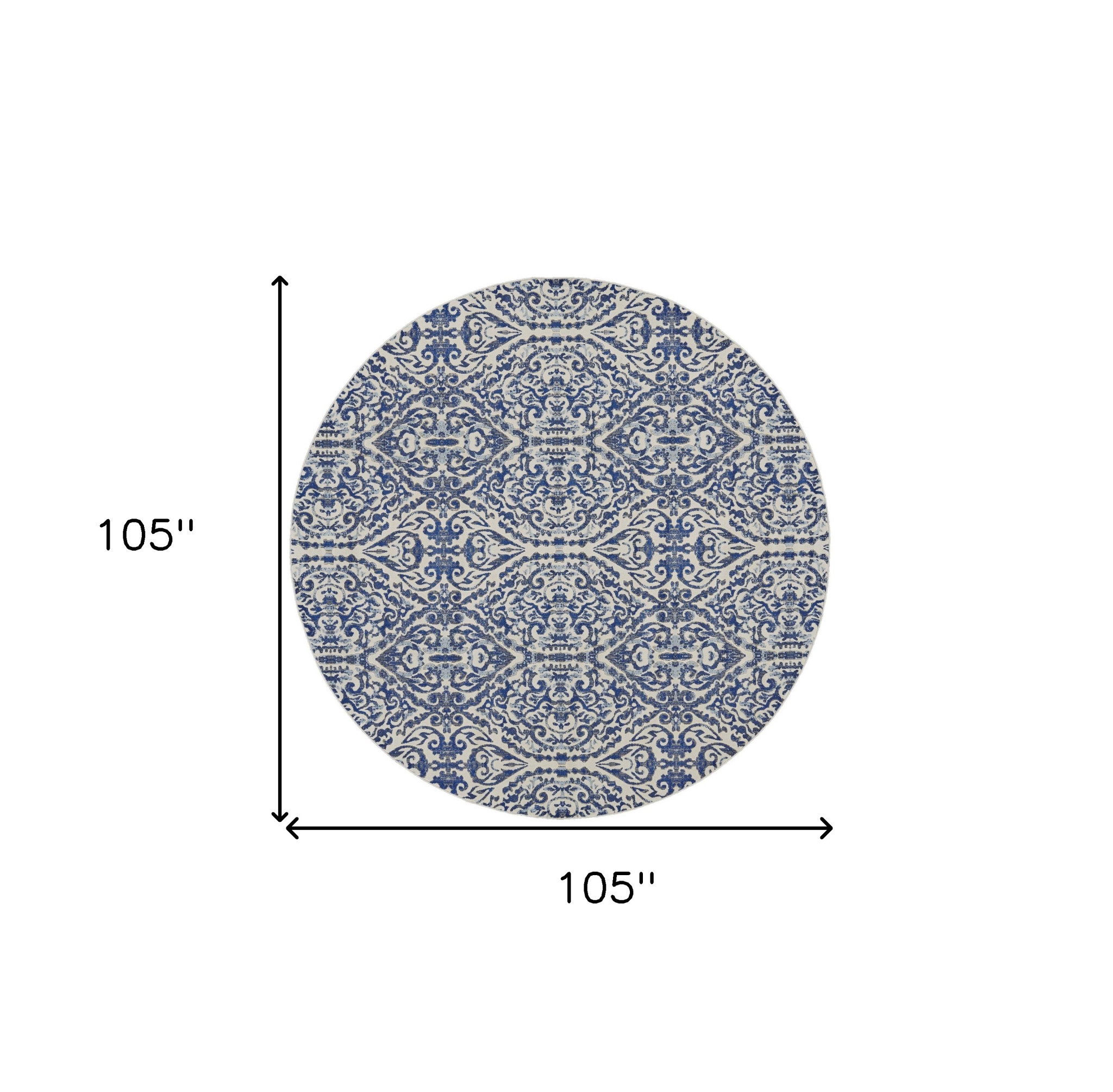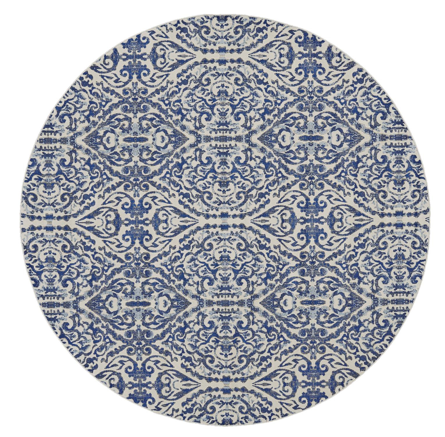 Set an inviting tone in your space with this 9-foot blue and ivory round floral distressed area rug. This geometric round shaped rug features a floral pattern in blue and ivory that combines a good looking print with a unique and updated shape. The mix of shape, color, and design gives this rug refreshing visual interest. Ideal for spaces with kids and pets, this rug is stain resistant to help repel stains and spilled liquids. Place this area rug against a hardwood or tile floor and it will enliven your living space with style and sophistication. 105-inch H x 105-inch W x 0.41-inch D
