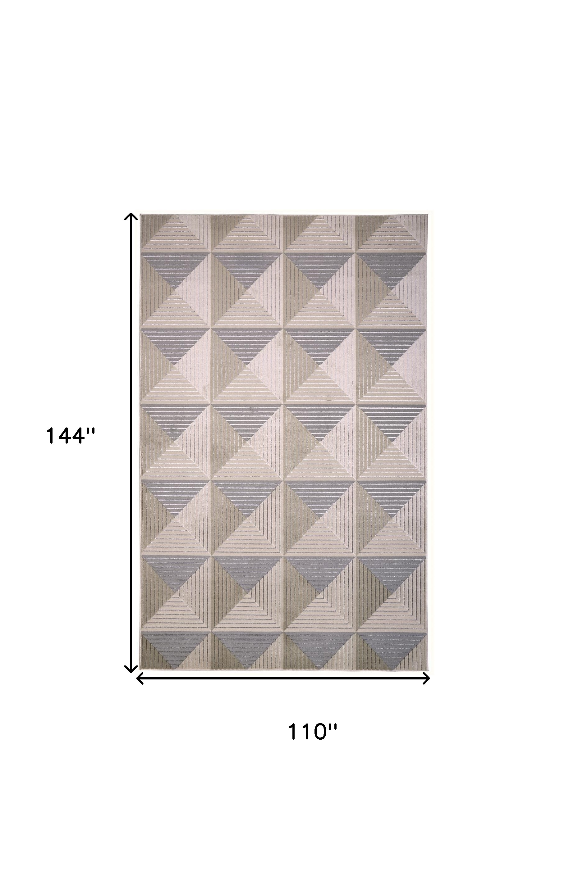 Set an inviting tone in your space with this 9' x 12' beige gray and ivory geometric area rug. This rectangle shaped rug features a geometric design in beige gray and ivory to give it visual interest. A classic shape marries with good looking design for your space This superior Turkish rug represents the highest quality and is built to last. Place this area rug against a hardwood or tile floor and it will enliven your living space with style and sophistication. 0.39" H x 110" W x 144" D
