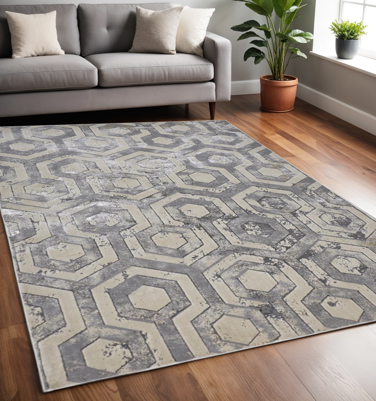 Set an inviting tone in your space with this 5-foot x 8-foot gray taupe and silver abstract area rug. Ideal for spaces with kids and pets, this rug is stain resistant to help repel dirt and spilled liquids. Built to last, this rug crafted from polyester fibers is known for its durability and long lasting appeal. Rugs are a great way to showcase your style, hide imperfections, warm your home and reduce noise. 60.00-inch h x 96.00-inch w x 0.39-inch d.