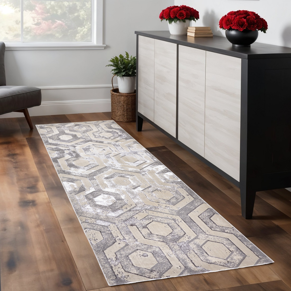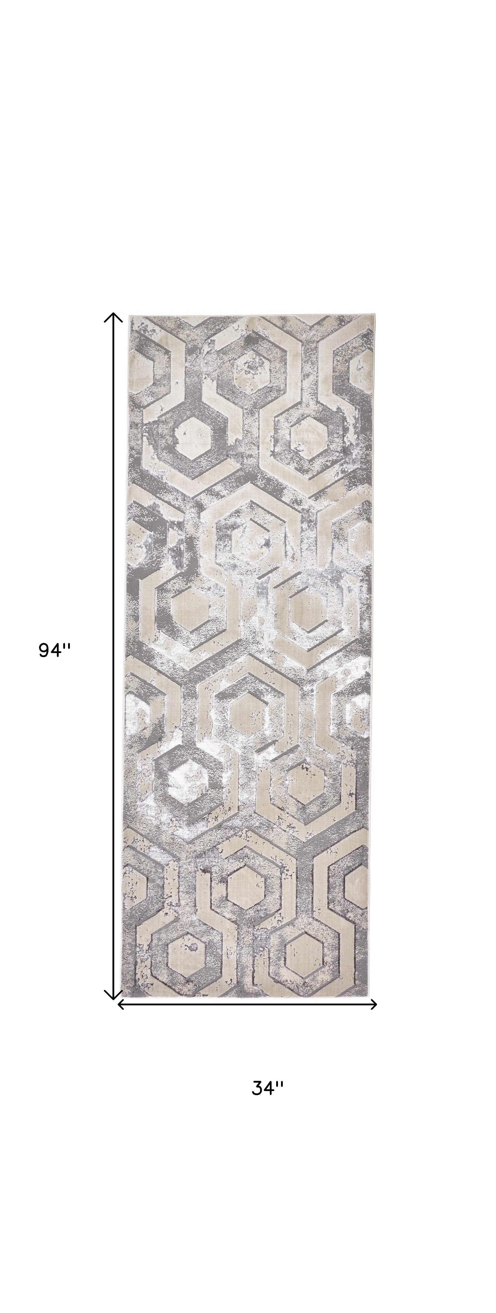 This 8' gray taupe and silver abstract runner rug, is a great way to add warmth to a room. This runner shaped rug features a abstract design in gray taupe and silver to give it visual interest. A classic shape marries with good looking design for your space Made in Turkey, this rug offers high quality combined with good looking designer sensibilities. Ideal for spaces with kids and pets, this rug is stain resistant to help repel stains and spilled liquids. Place this area rug against a hardwood or tile floor and it will enliven your living space with style and sophistication. 0.39" H x 34" W x 94" D
