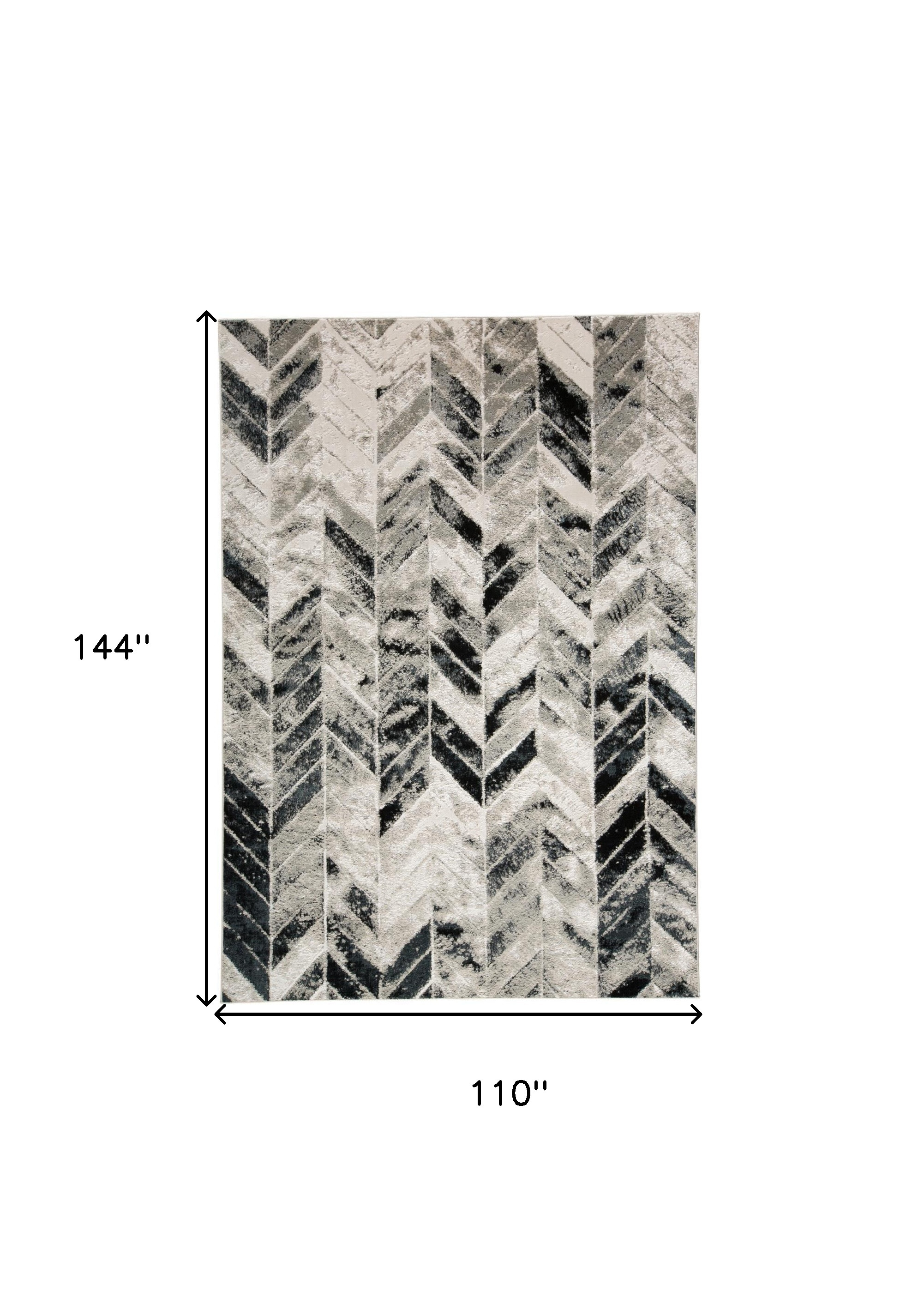 This 9-foot x 12-foot gray and black chevron area rug, is a great way to add warmth to a room. Built to last, this rug crafted from polyester fibers is known for its durability and long lasting appeal. Rugs are a great way to showcase your style, hide imperfections, warm your home and reduce noise. This larger sized, modern styled rug is ready to create a focal point or statement piece in your room. 110.00-inch h x 144.00-inch w x 0.39-inch d.