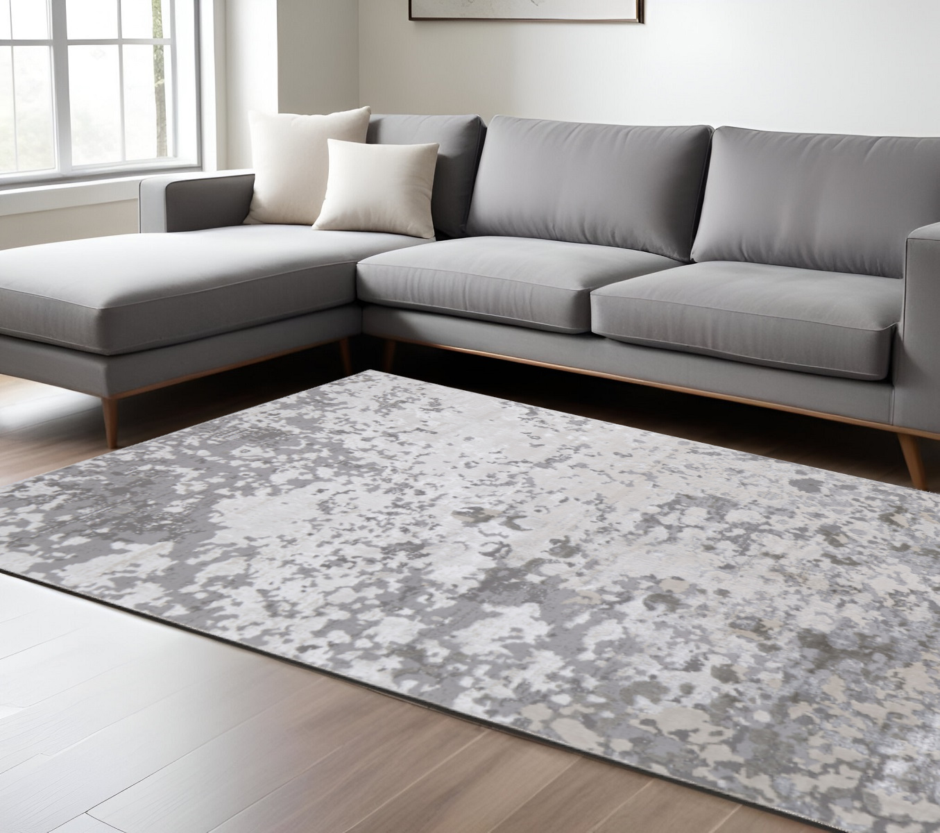 This 7' x 10' silver gray and white abstract stain resistant area rug, is a great way to add warmth to a room. This rectangle shaped rug features a abstract design in silver gray and white to give it visual interest. A classic shape marries with good looking design for your space This superior Turkish rug represents the highest quality and is built to last. Ideal for spaces with kids and pets, this rug is stain resistant to help repel stains and spilled liquids. Place this area rug against a hardwood or tile floor and it will enliven your living space with style and sophistication. 0.39" H x 79" W x 114" D