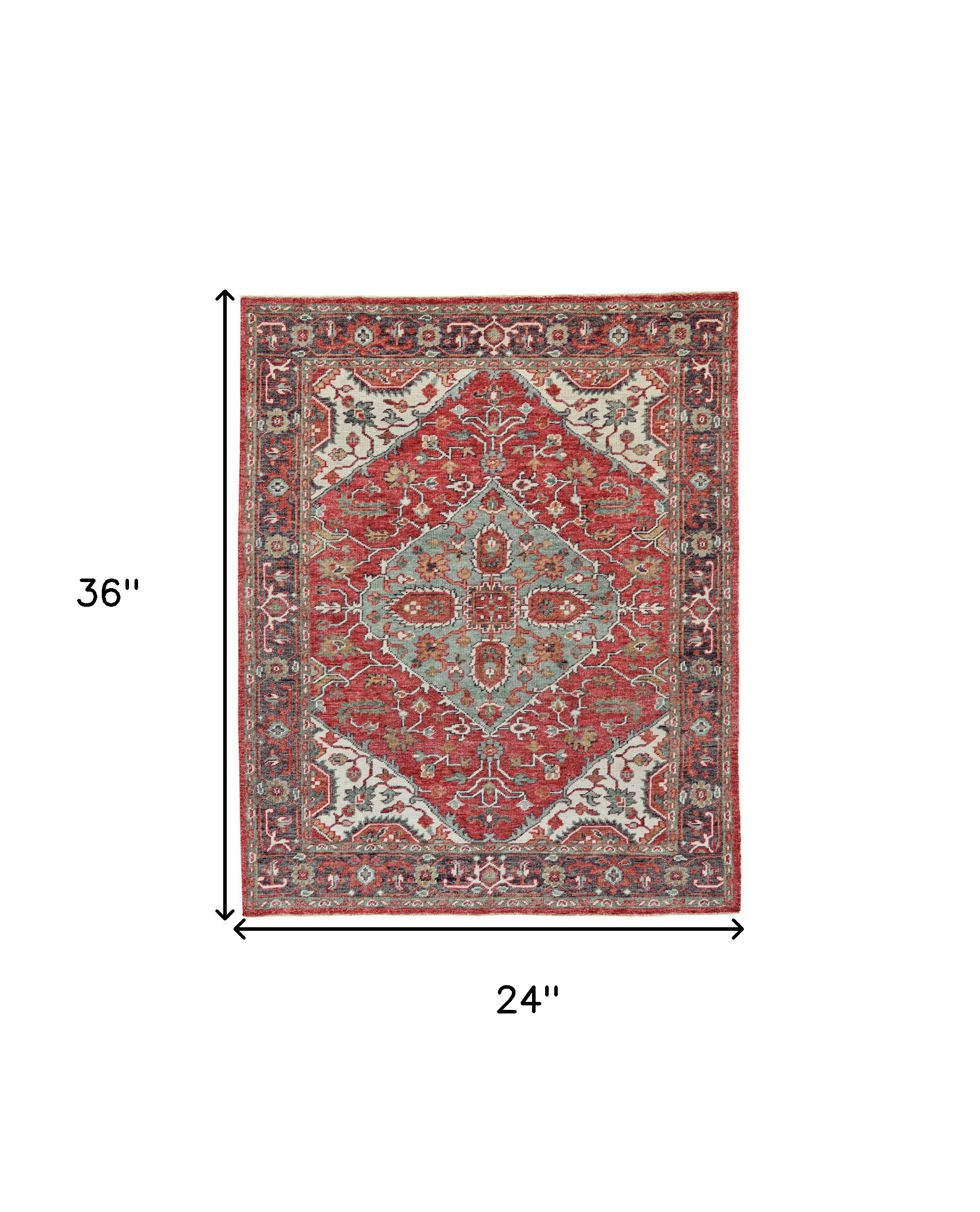 Set an inviting tone in your space with this 2' x 3' red gray and ivory wool floral hand knotted distressed stain resistant area rug with fringe. This rectangle shaped rug features a floral design in red gray and ivory to give it visual interest. A classic shape marries with good looking design for your space Ideal for spaces with kids and pets, this rug is stain resistant to help repel stains and spilled liquids. Tassel ends bring a timeless and fashionable look to your interior. Crafted by skilled artisans, this hand knotted rug is genuine and unique. No two will be exactly alike. Place this area rug against a hardwood or tile floor and it will enliven your living space with style and sophistication. 0.28" H x 24" W x 36" D