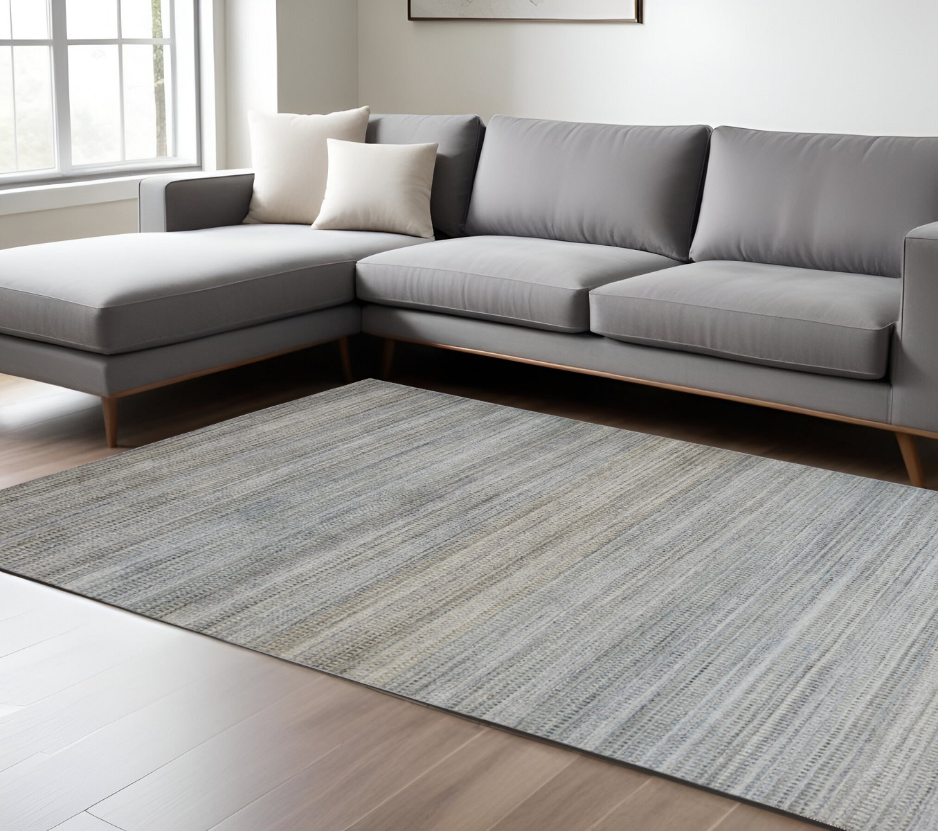 Add some artistry to your room with this 8-foot x 11-foot blue and gray ombre hand woven area rug. This rectangle shaped rug features a ombre design in blue and gray to give it visual interest. A classic shape marries with good looking design for your space crafted by skilled artisans, this hand woven rug is genuine and unique. No two will be exactly alike. 96-inch H x 132-inch W x 0.31-inch D