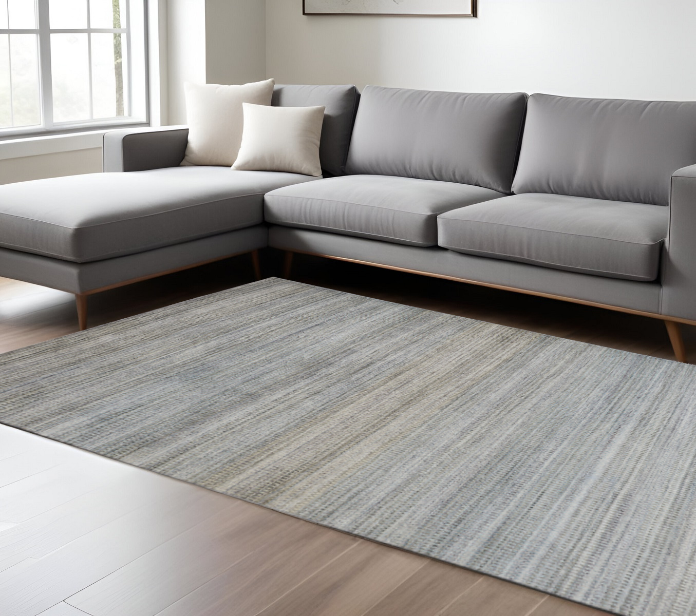 Add some artistry to your room with this 10' x 13' blue gray and purple ombre hand woven area rug. This rectangle shaped rug features a ombre design in blue gray and purple to give it visual interest. A classic shape marries with good looking design for your space Crafted by skilled artisans, this hand woven rug is genuine and unique. No two will be exactly alike. Area Rugs help to give warmth and sense of home to your space. 0.31" H x 114" W x 162" D