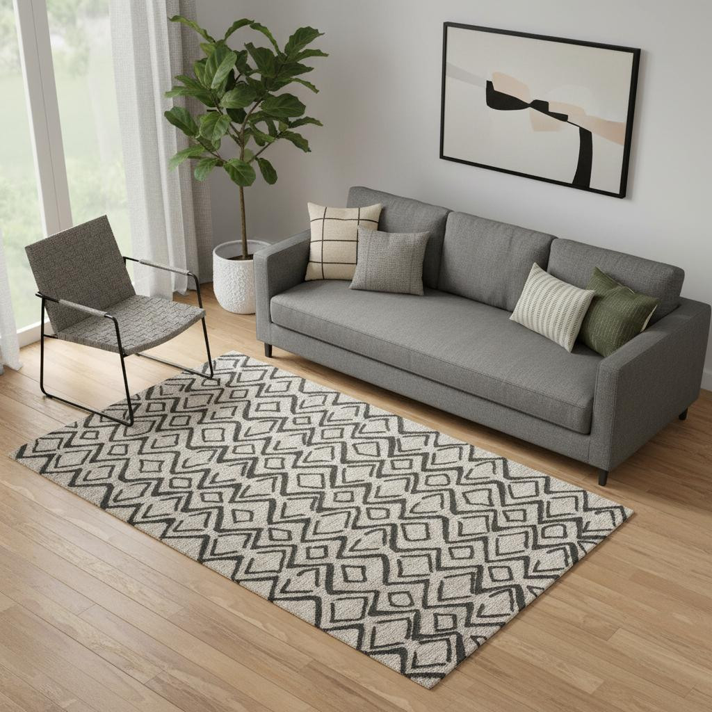 geometric hand tufted area rug, hand tufted area rug, tufted area rug, black taupe gray wool, taupe gray wool geometric hand |