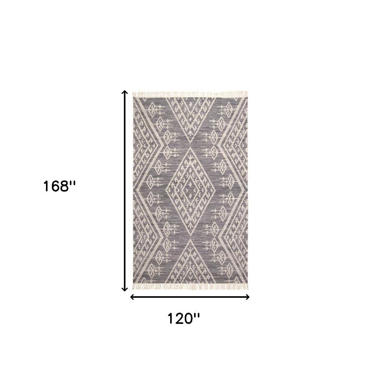 This 10' x 14' gray ivory and blue wool geometric dhurrie flatweave handmade area rug with fringe, is a great way to add warmth to a room. This rectangle shaped rug features a geometric design in gray ivory and blue to give it visual interest. A classic shape marries with good looking design for your space Tassel ends bring a timeless and fashionable look to your interior. Place this area rug against a hardwood or tile floor and it will enliven your living space with style and sophistication. 0.4" H x 120" W x 168" D