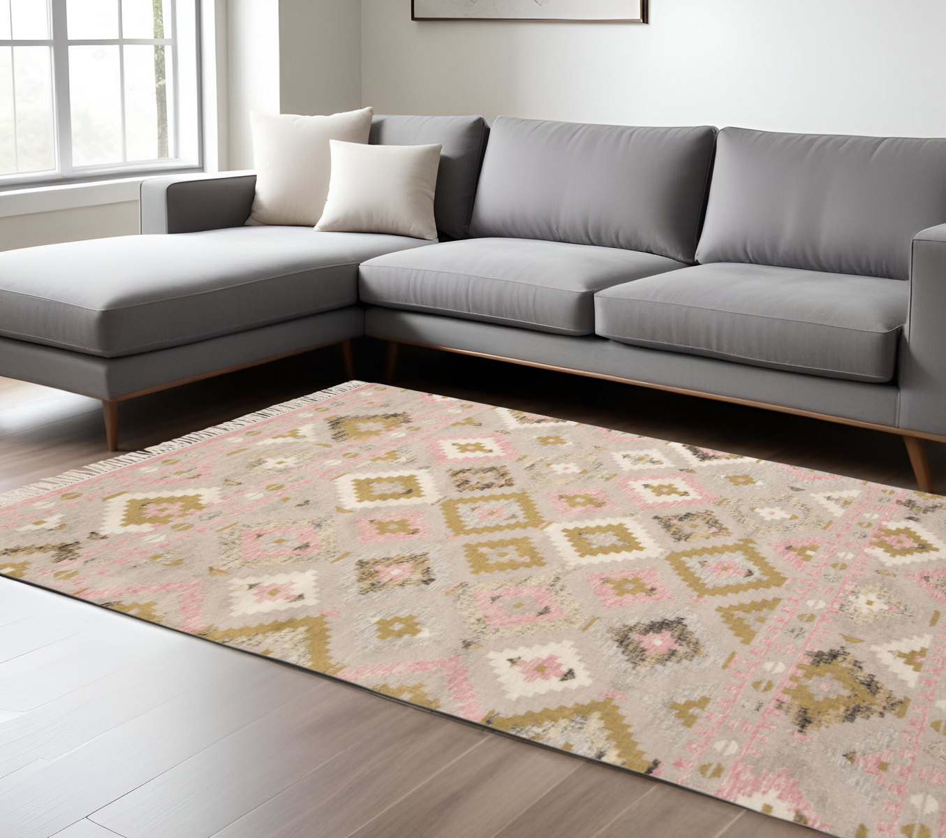 Add some artistry to your room with this 10-foot x 14-foot pink gold and taupe wool geometric dhurrie flatweave handmade area rug with fringe. This rectangle shaped rug features a geometric design that will add a functional and decorative accent to your space. Tassel ends bring a timeless and fashionable look to your interior. This smaller sized rug is just what you need for your walkway, or in front of door, cabinet, refrigerator, or chair. 120-inch h x 168-inch w x 0.39-inch d