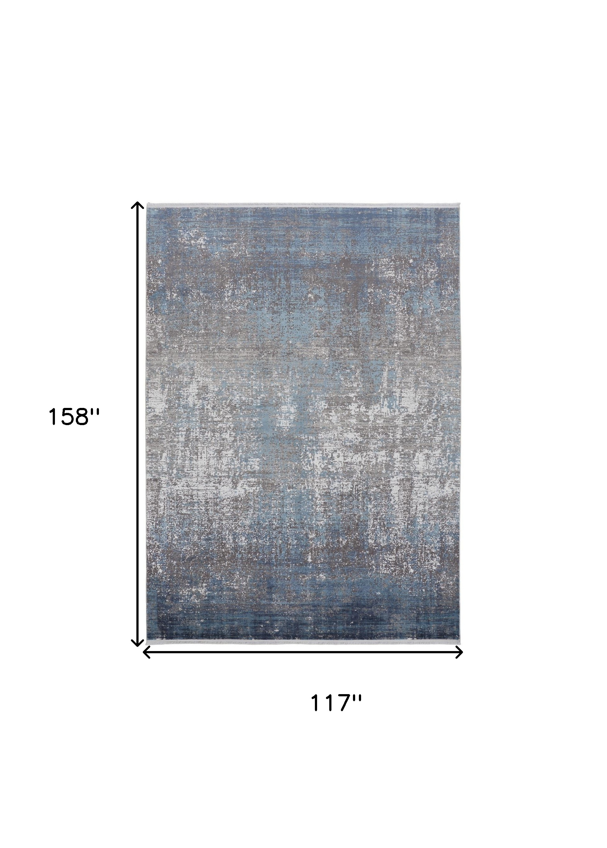 Add great coloration and comfortable texture to your space with this 10' x 13' blue gray and silver abstract power loom distressed area rug with fringe. This rectangle shaped rug features a abstract design in blue gray and silver to give it visual interest. A classic shape marries with good looking design for your space This superior Turkish rug represents the highest quality and is built to last. Tassel ends bring a timeless and fashionable look to your interior. Place this area rug against a hardwood or tile floor and it will enliven your living space with style and sophistication. 0.32" H x 117" W x 158" D