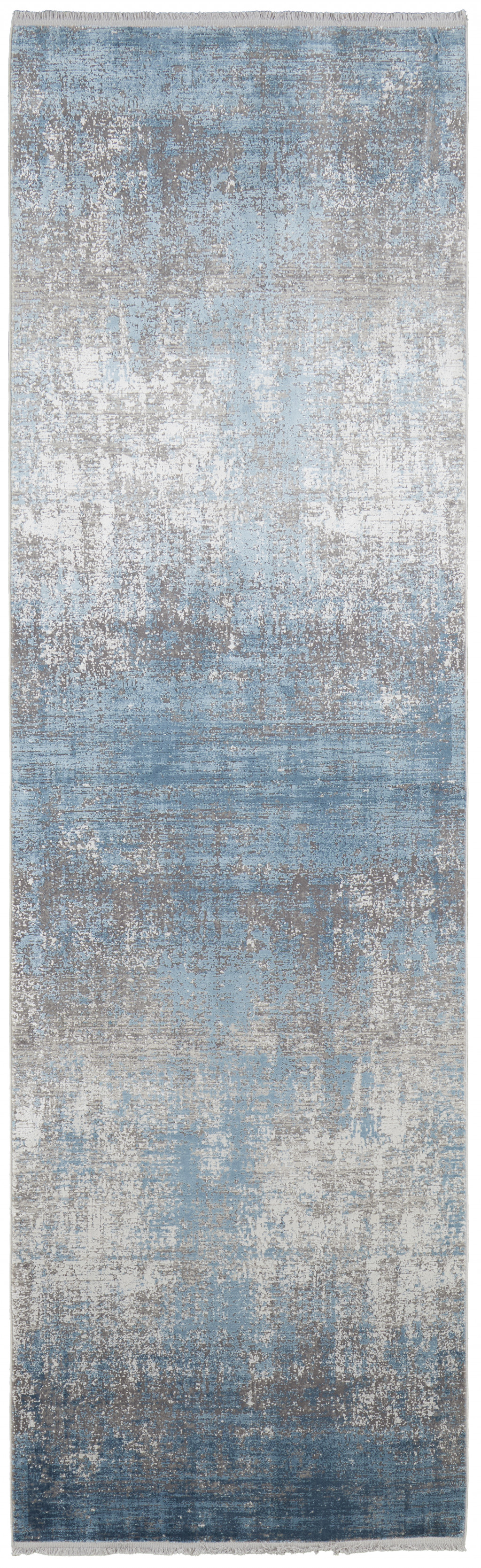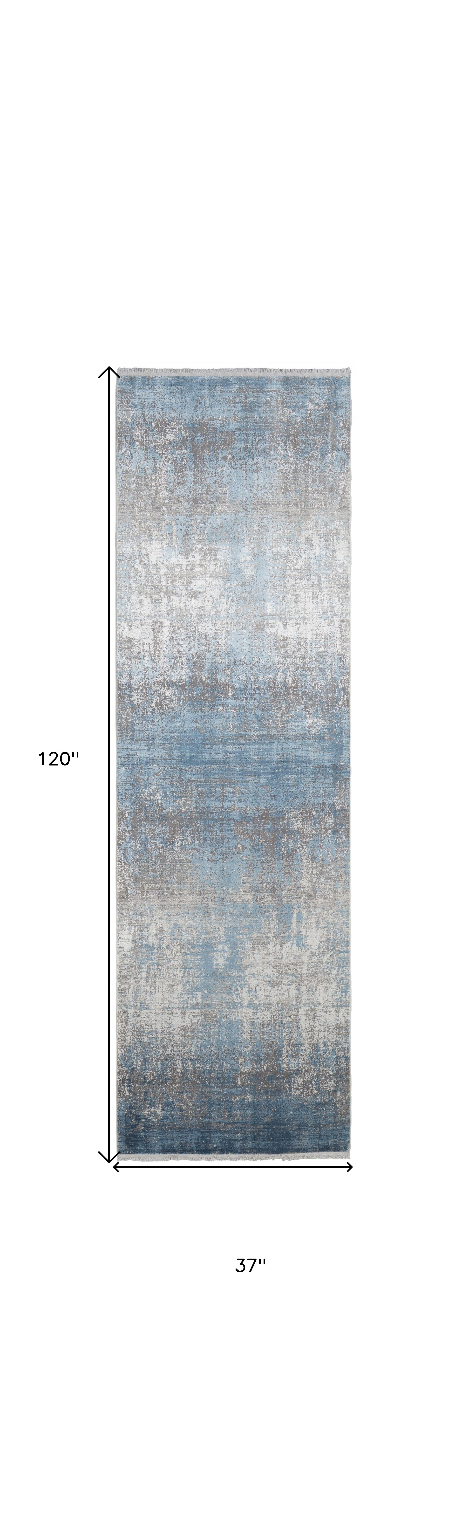 This 10-foot blue and gray abstract power loom distressed runner rug with fringe, is a great way to add warmth to a room. This runner shaped rug features a abstract design in blue and gray to give it visual interest. A classic shape marries with good looking design for your space tassel ends bring a timeless and fashionable look to your interior. 37-inch H x 120-inch W x 0.32-inch D