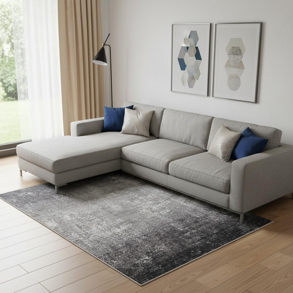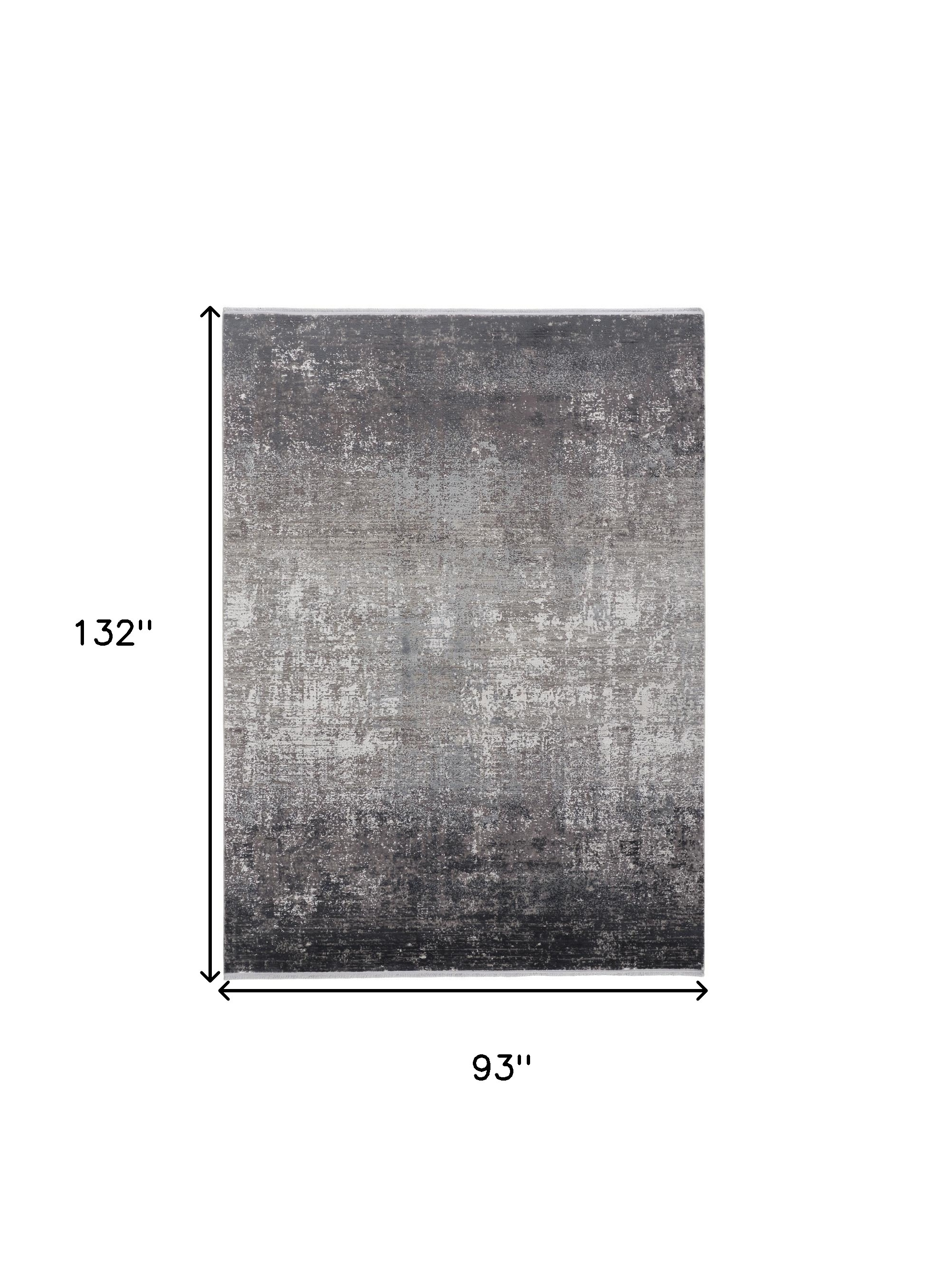 Set an inviting tone in your space with this 8' x 11' gray black and silver abstract power loom distressed area rug with fringe. This rectangle shaped rug features a abstract design in gray black and silver to give it visual interest. A classic shape marries with good looking design for your space This superior Turkish rug represents the highest quality and is built to last. Tassel ends bring a timeless and fashionable look to your interior. Place this area rug against a hardwood or tile floor and it will enliven your living space with style and sophistication. 0.32" H x 93" W x 132" D